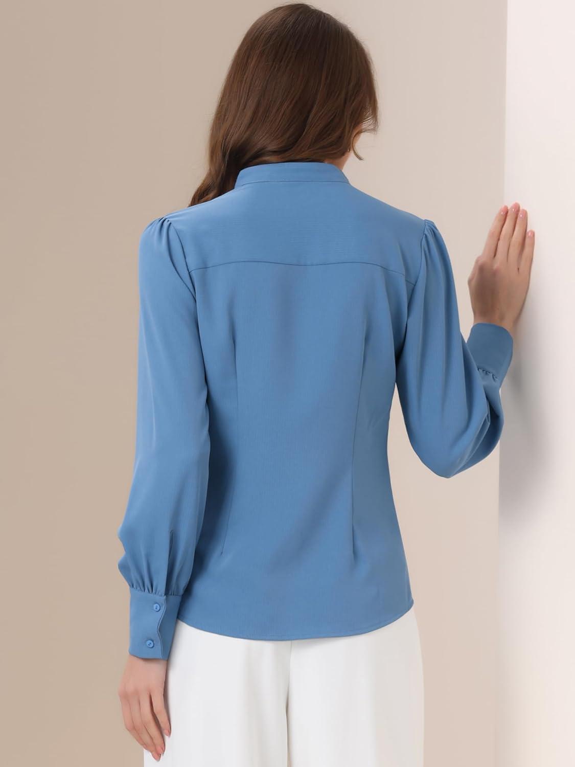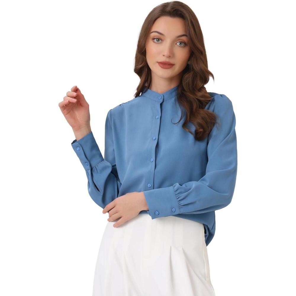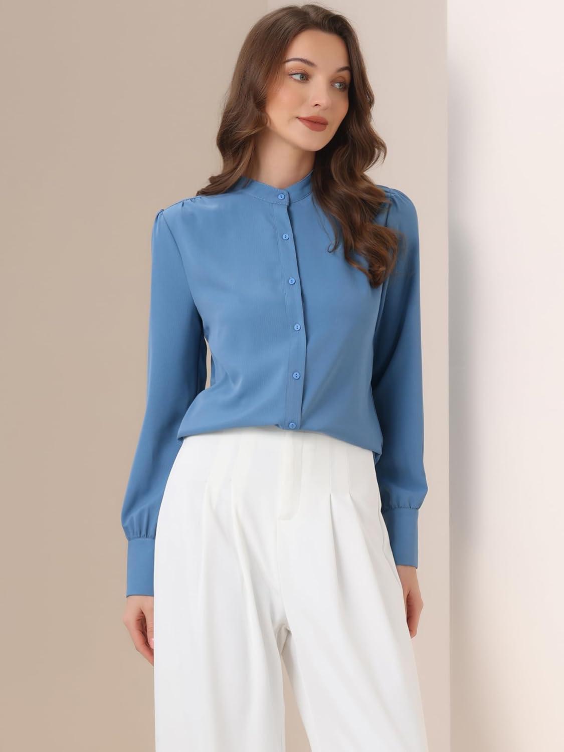 Allegra K Women’s Button Down Office Top Long Sleeve Formal Mandarin Collar Shirt(Dusty Blue)