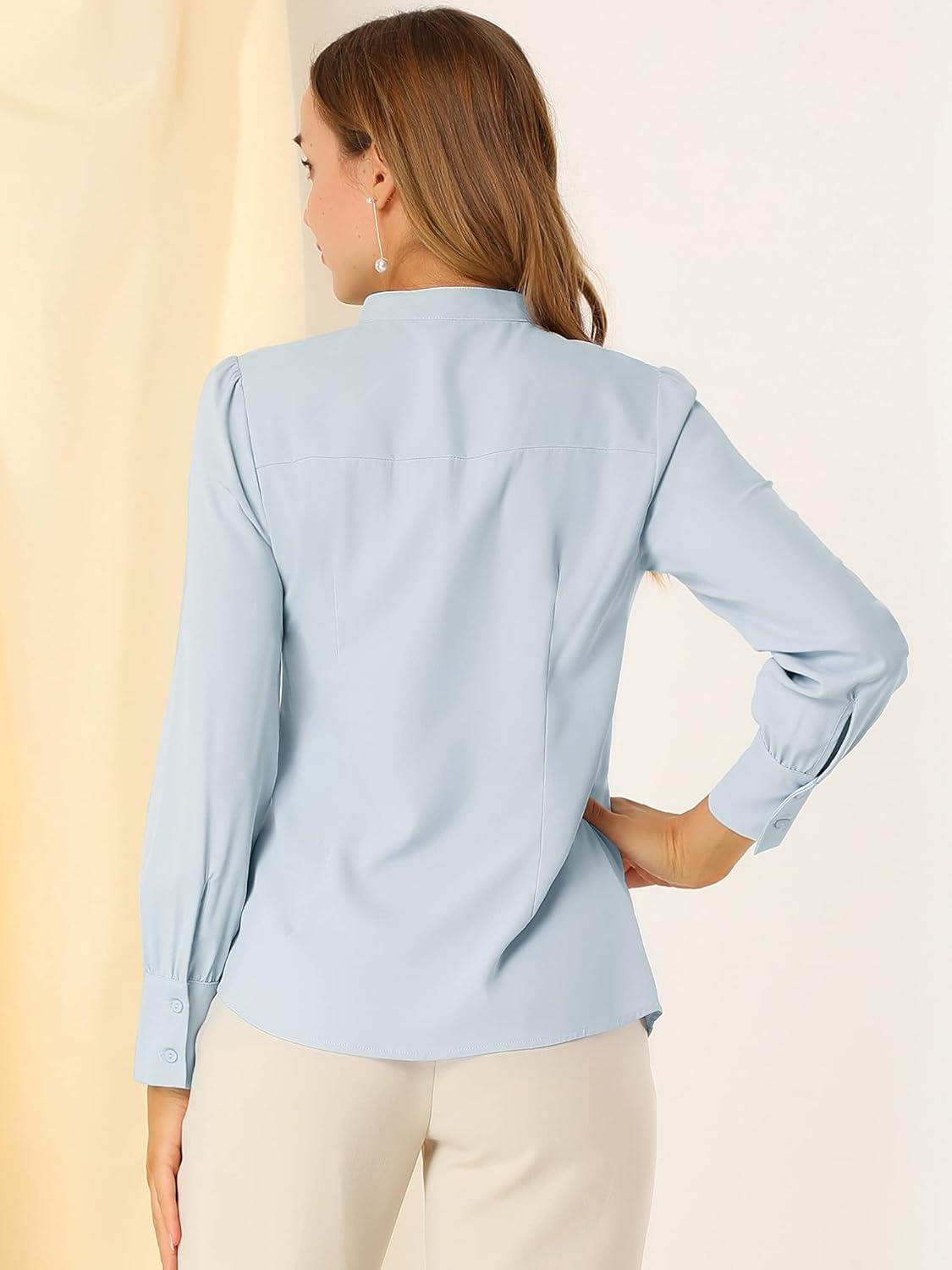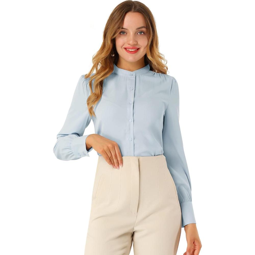 Allegra K Women’s Button Down Office Top Long Sleeve Formal Mandarin Collar Shirt(Light Blue)