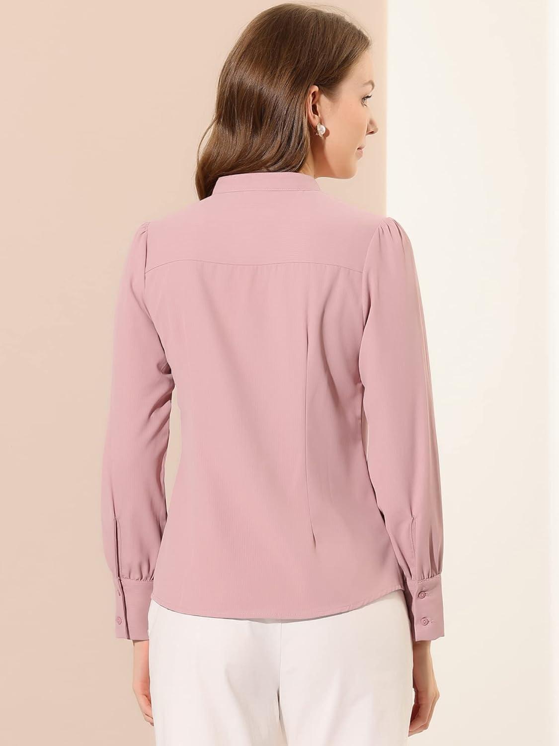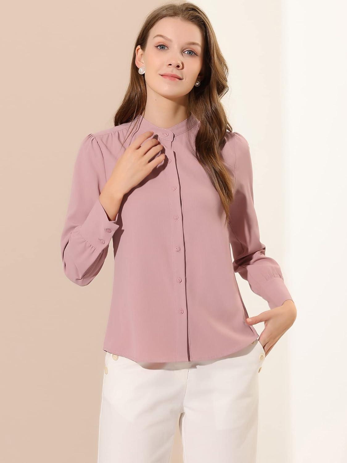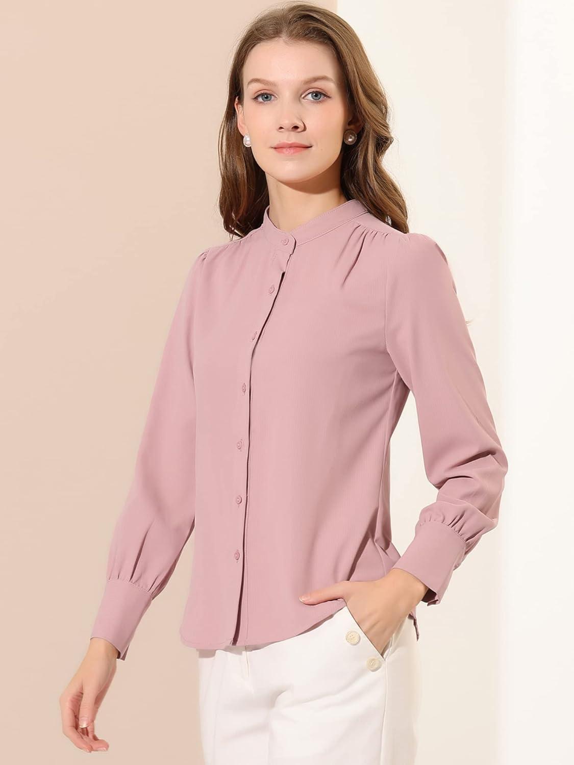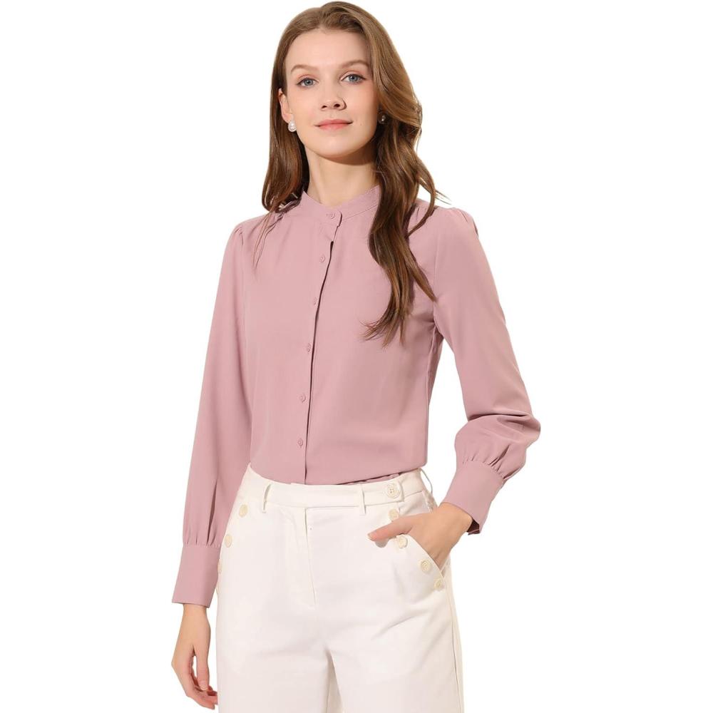 Allegra K Women’s Button Down Office Top Long Sleeve Formal Mandarin Collar Shirt(Pink)