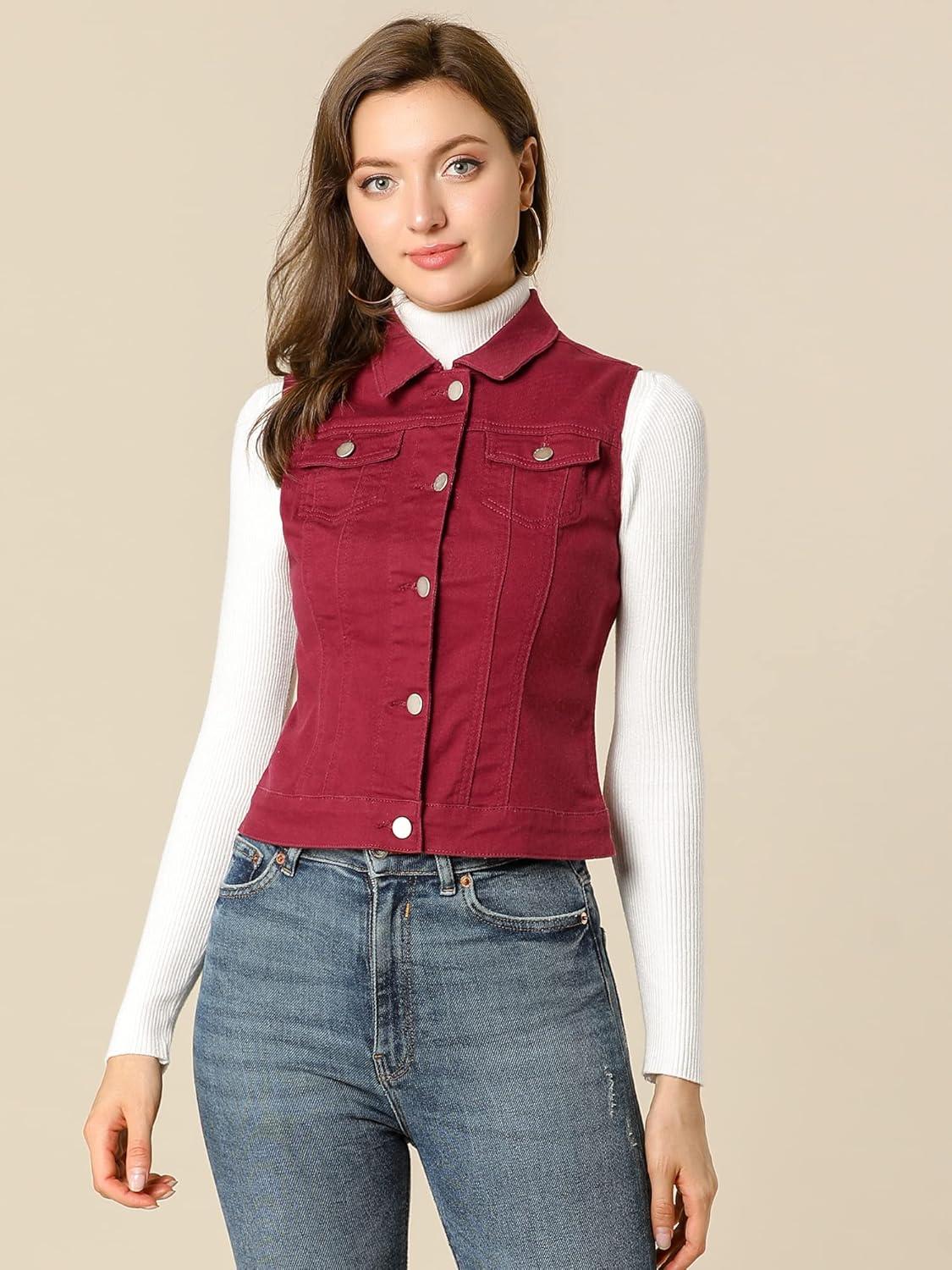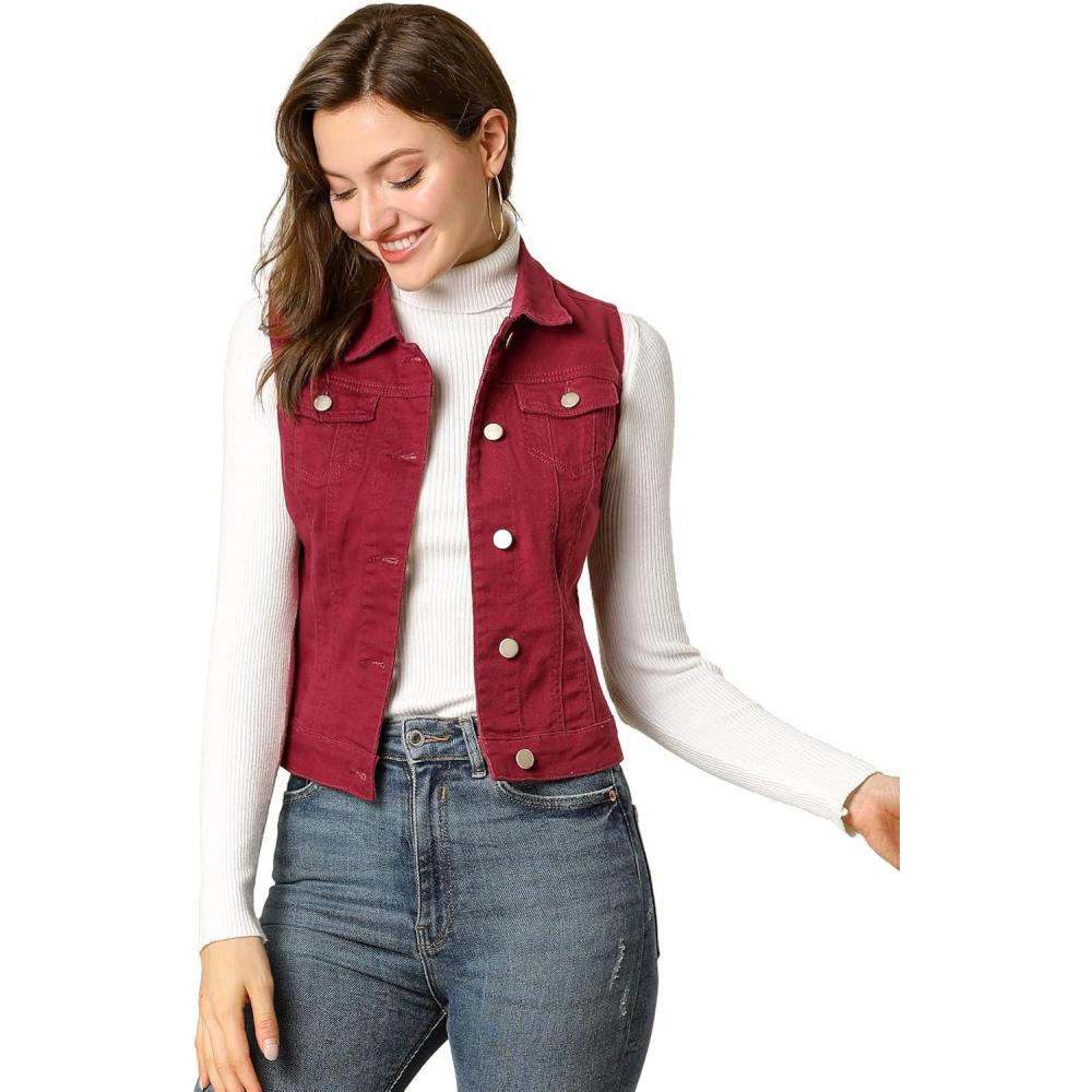 Allegra K Women’s Buttoned Washed Denim Vest Jacket W Chest Flap Pockets(Burgundy)