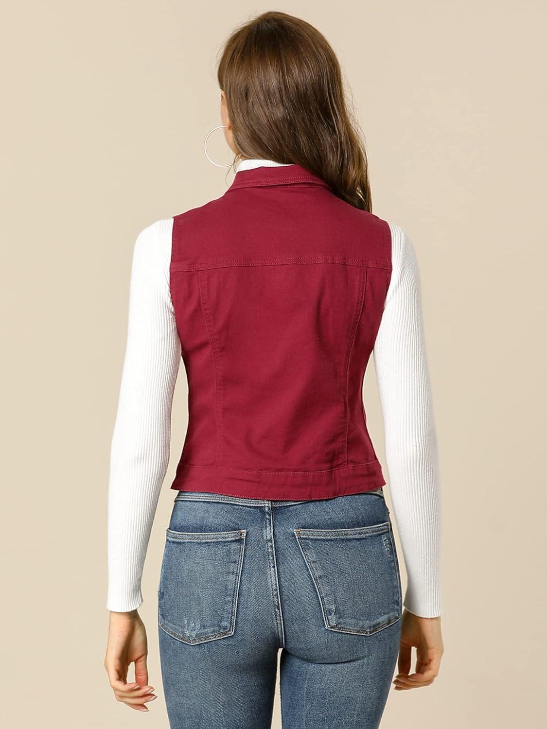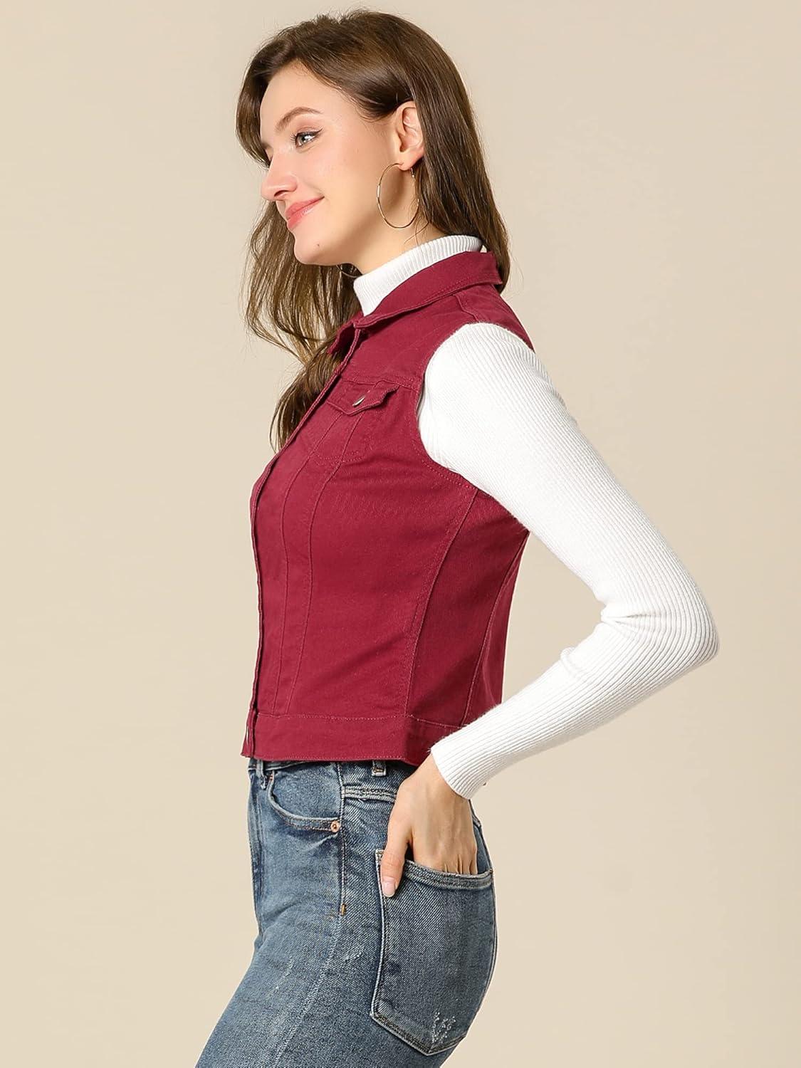 Allegra K Women's Buttoned Washed Denim Vest Jacket W Chest Flap Pockets(Burgundy)