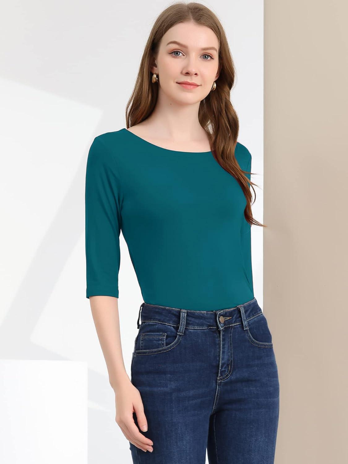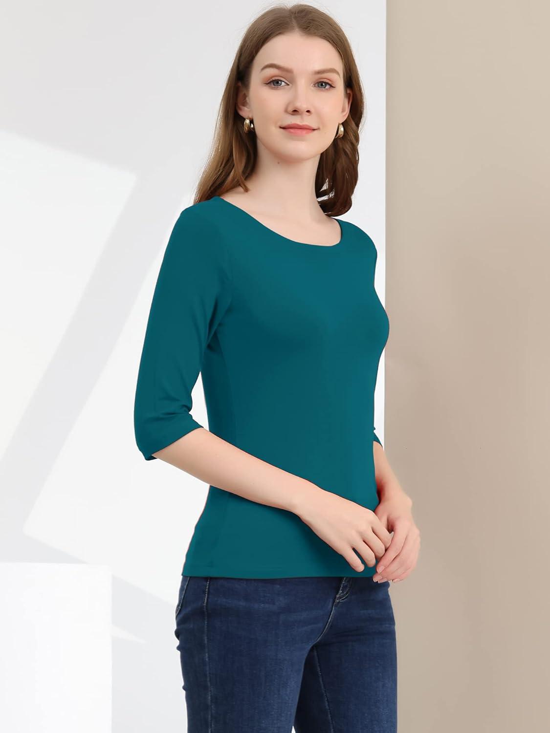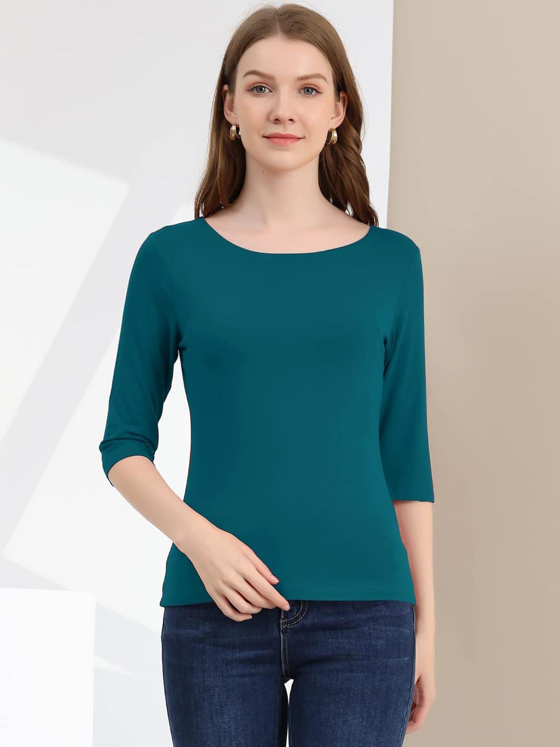 imageAllegra K Womens Casual Round Neck Elbow Sleeve t Shirts Slim Fit Blouses Tops FashionPeacock Blue