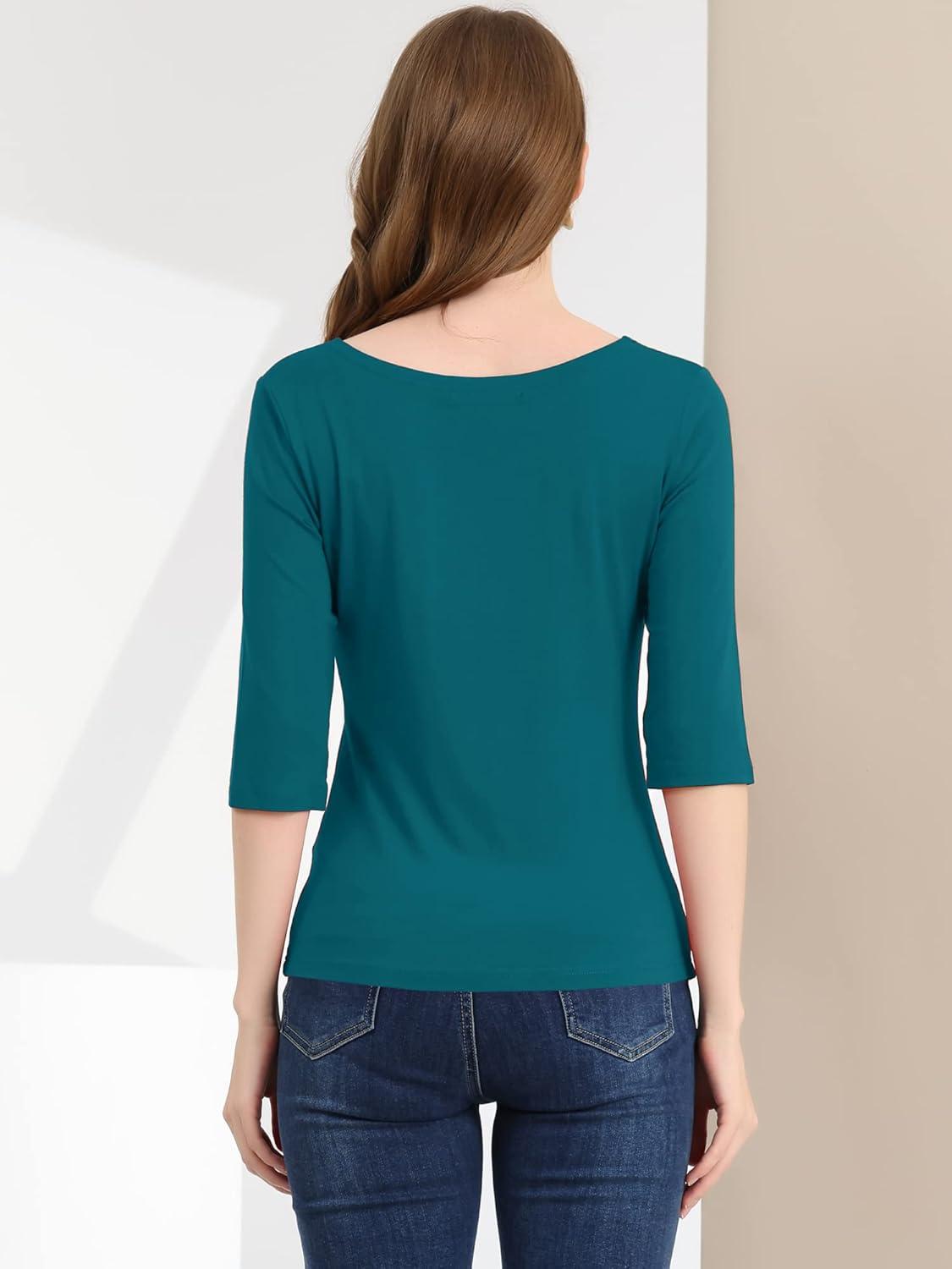 Allegra K Women’s Casual Round Neck Elbow Sleeve t Shirts Slim Fit Blouses Tops Fashion(Peacock Blue)