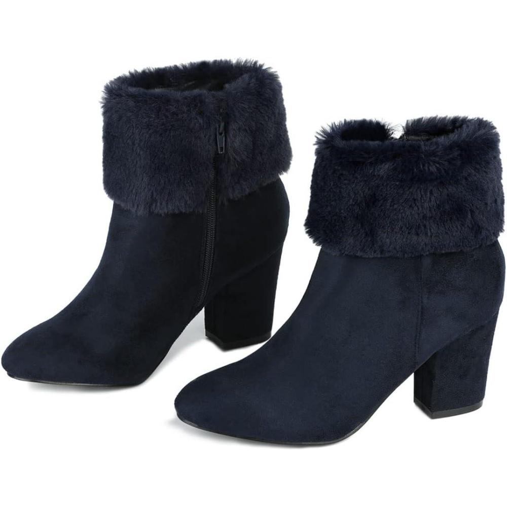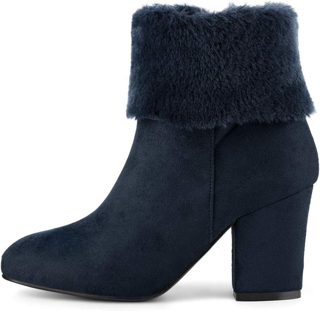 Allegra K Women’s Christmas Faux Fur Chunky Heel Ankle Boots(Navy Blue)