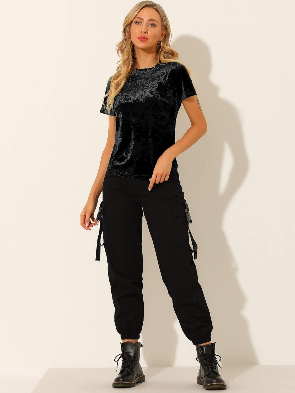 Allegra K Women’s Christmas Velvet Top Crew Neck Short Sleeve Casual T-Shirt(Black)