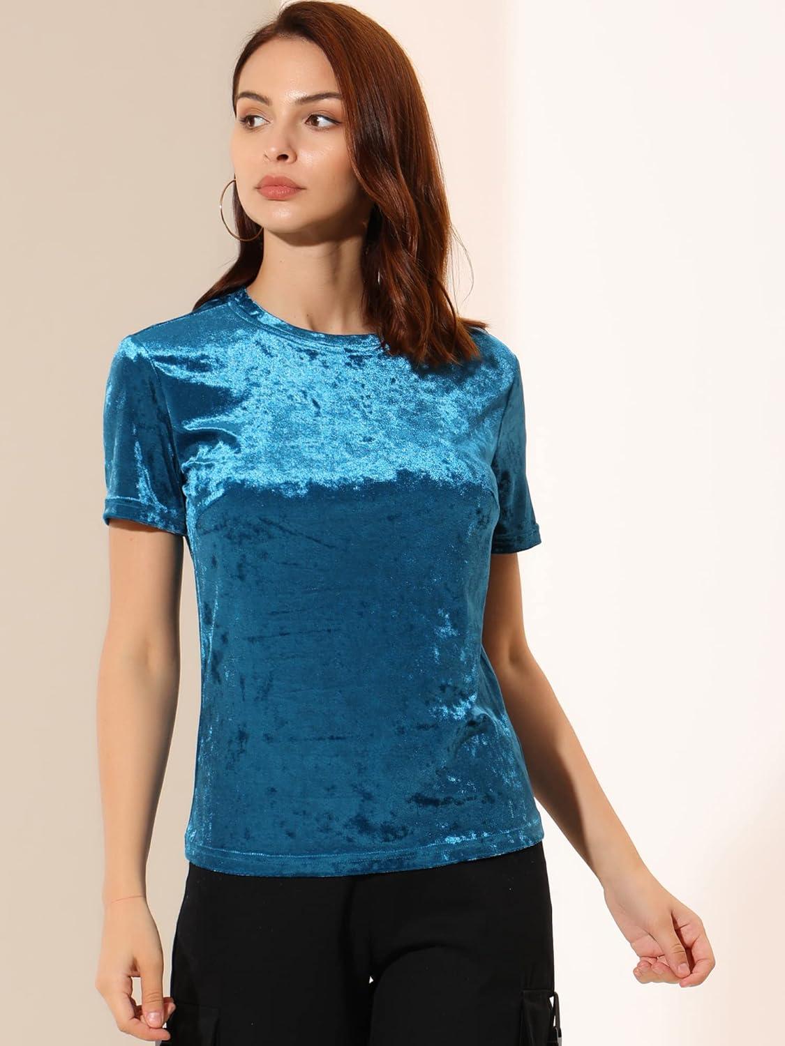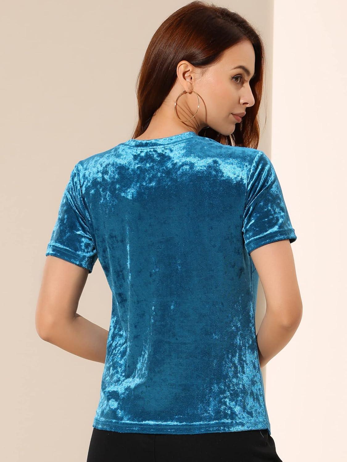 Allegra K Women's Christmas Velvet Top Crew Neck Short Sleeve Casual T-Shirt(Blue)