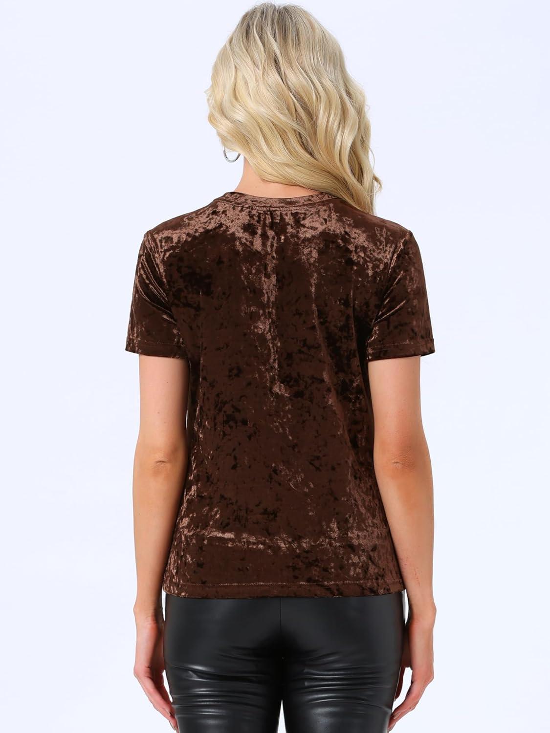 Allegra K Women's Christmas Velvet Top Crew Neck Short Sleeve Casual T-Shirt(Dark Brown)