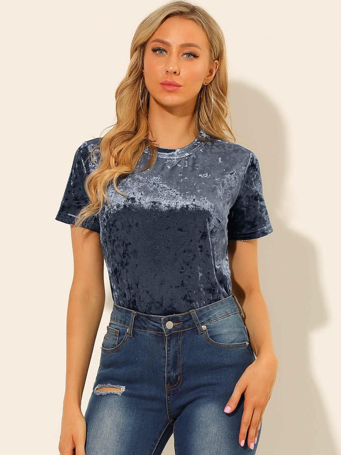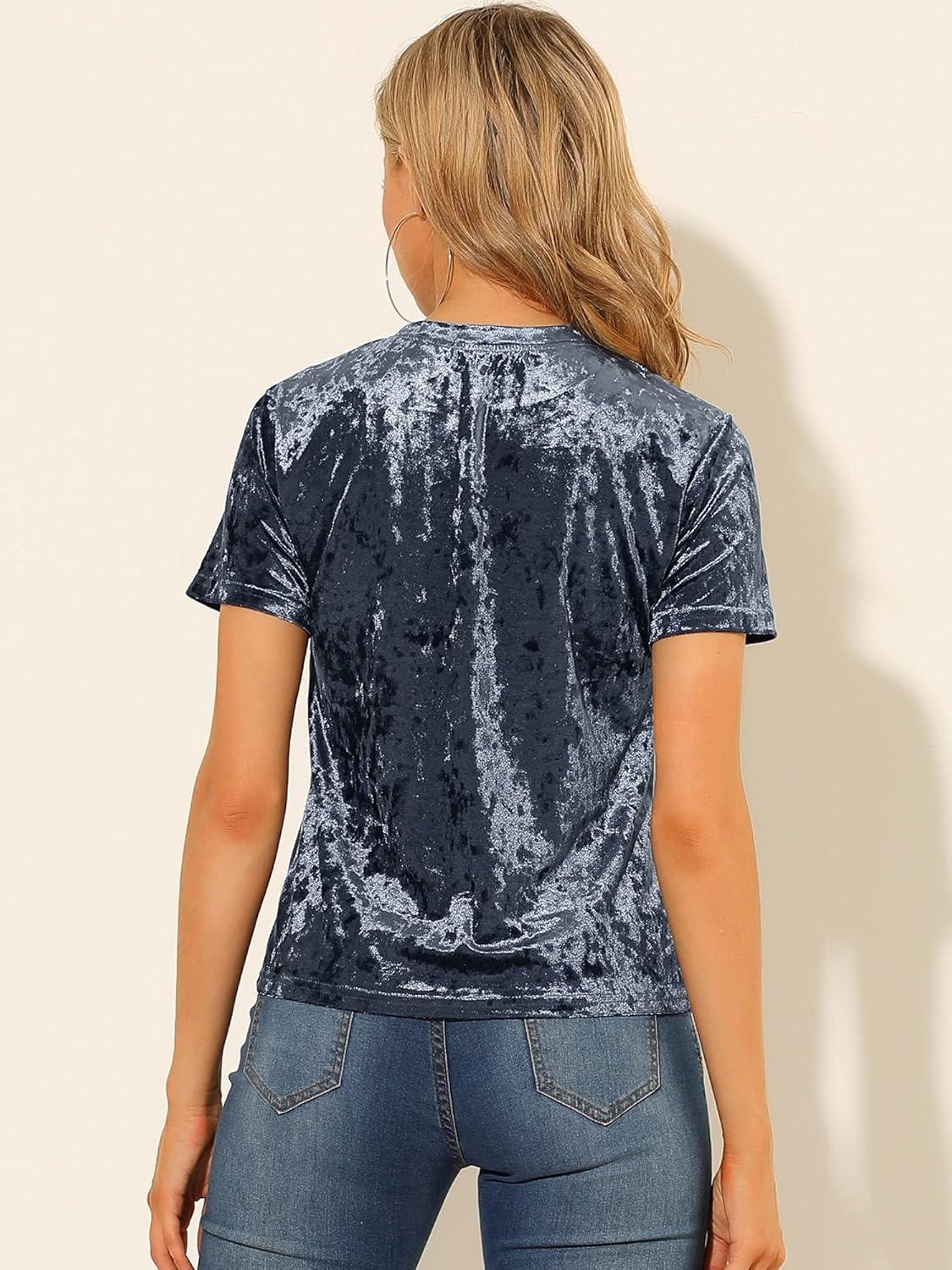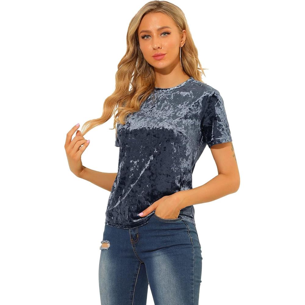 Allegra K Women’s Christmas Velvet Top Crew Neck Short Sleeve Casual T-Shirt(Gray Blue)