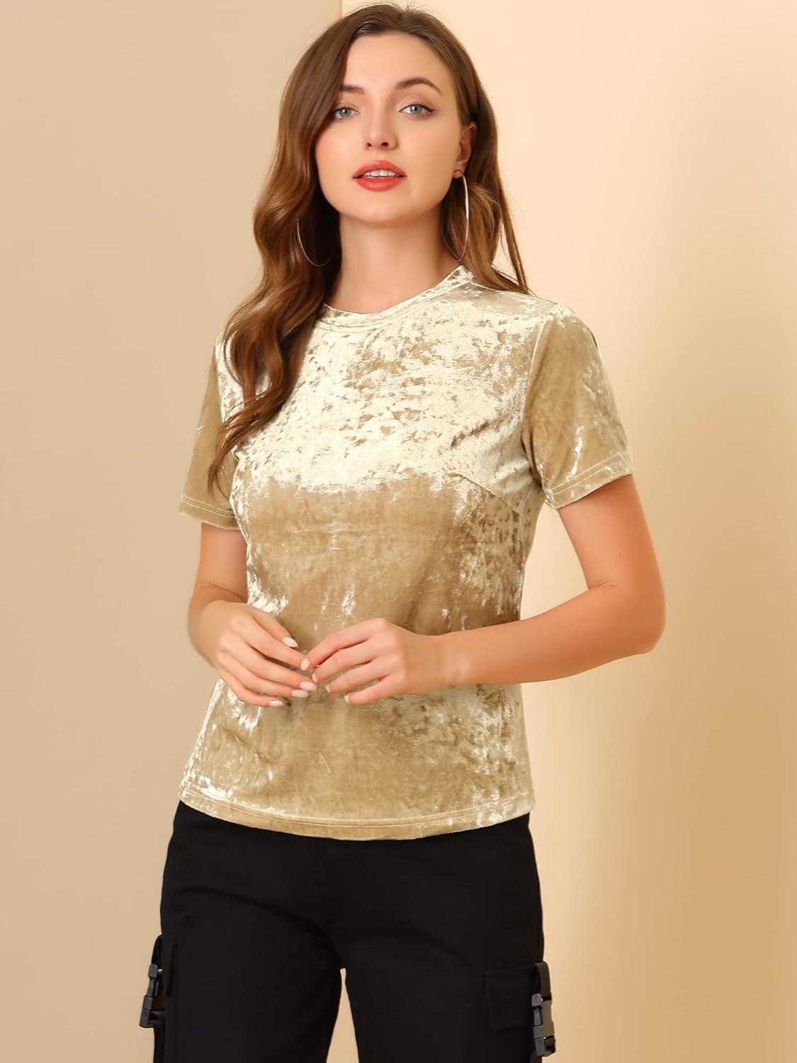 imageAllegra K Womens Christmas Velvet Top Crew Neck Short Sleeve Casual TShirtLight Beige