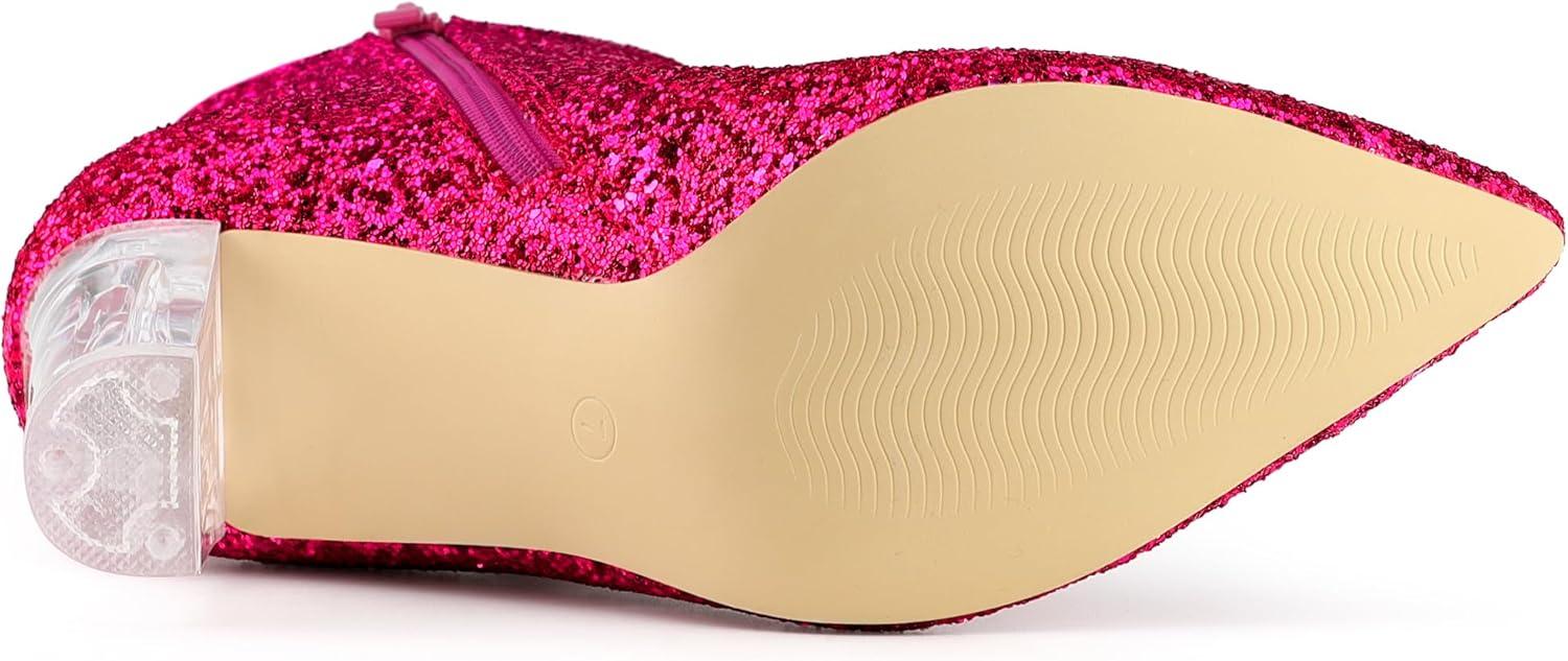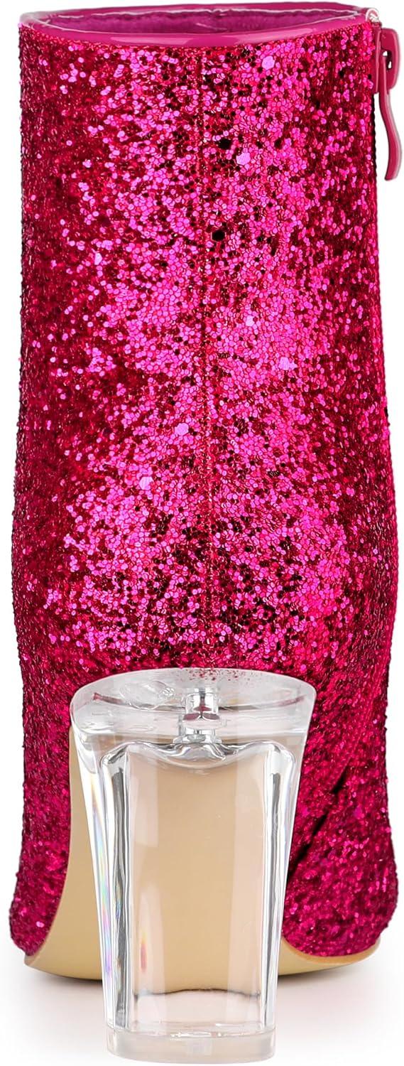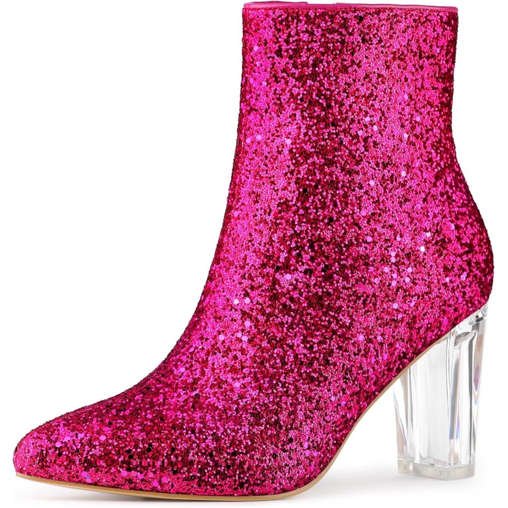 Allegra K Women’s Clear Block Heel Glitter Ankle Boots(Hot Pink)