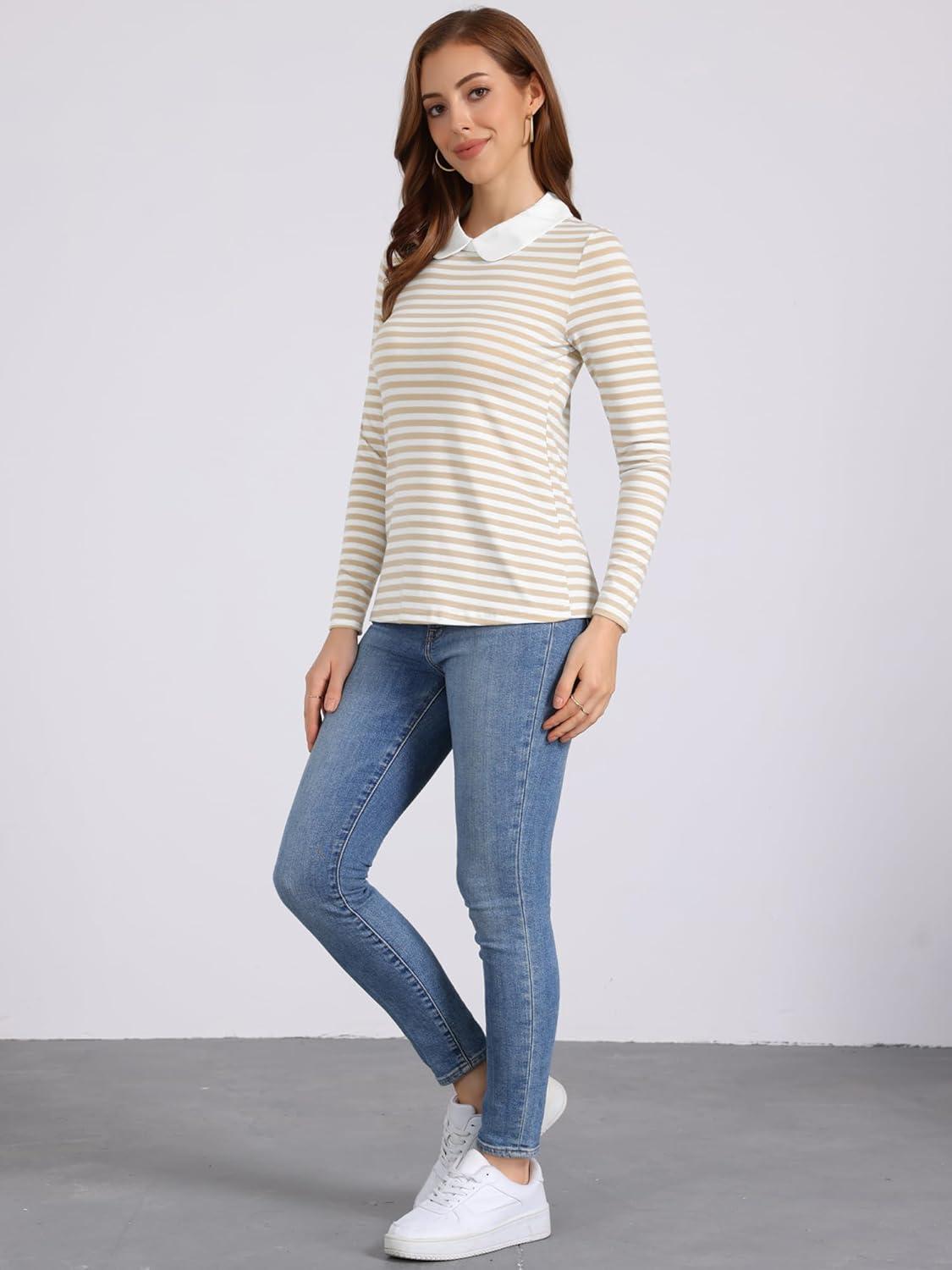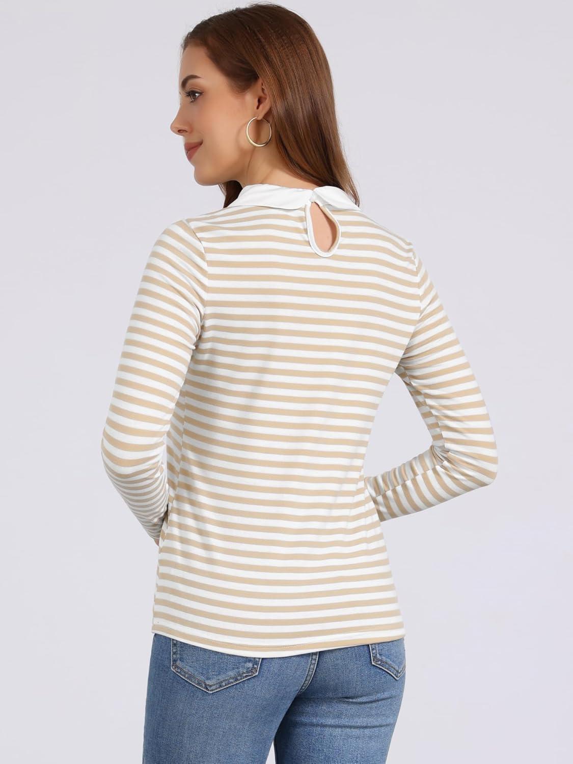 Allegra K Women's Contrast Collar Long Sleeves Peter Pan Collar Halloween Striped Blouse Top(Apricot)