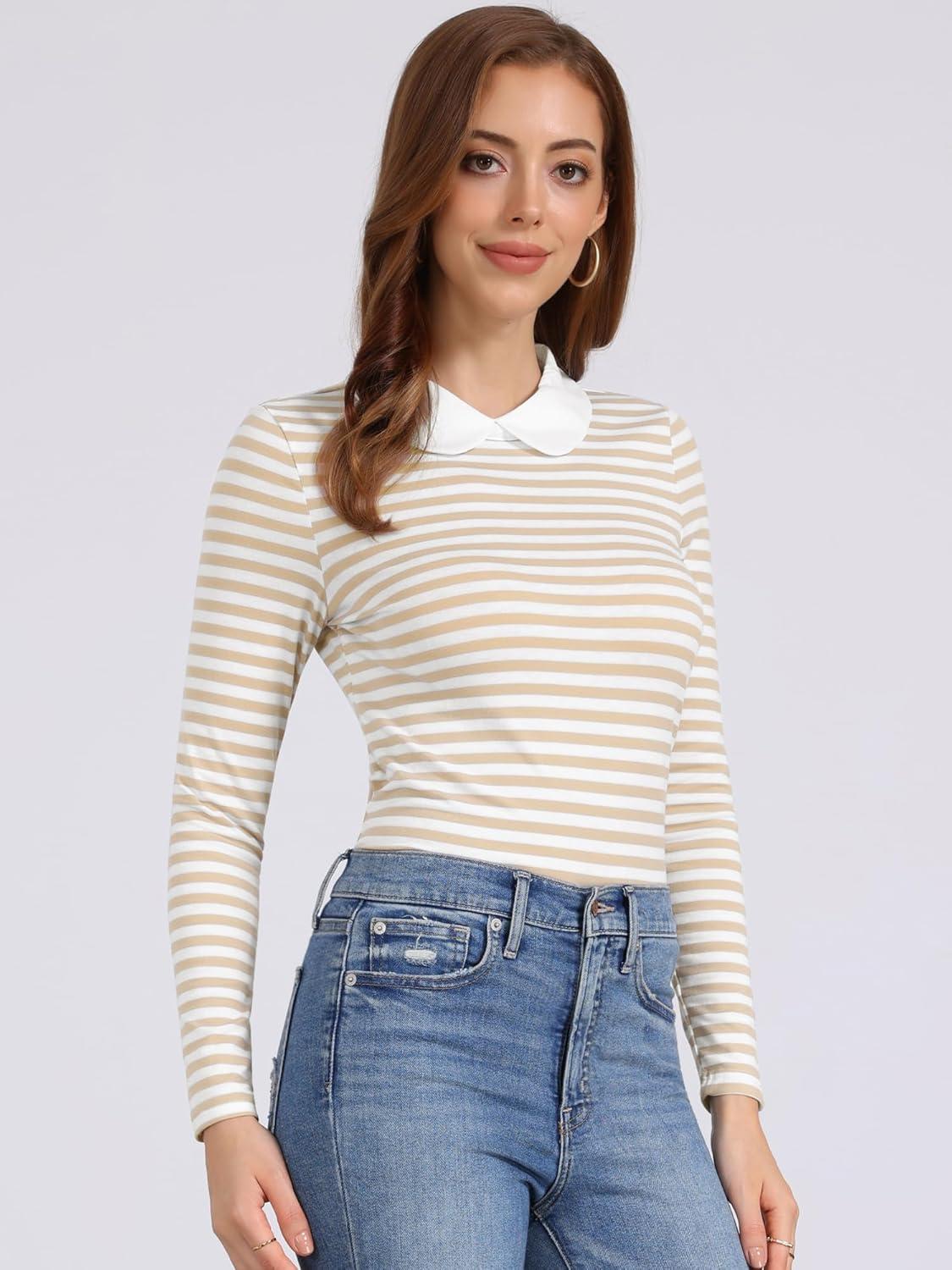 Allegra K Women’s Contrast Collar Long Sleeves Peter Pan Collar Halloween Striped Blouse Top(Apricot)