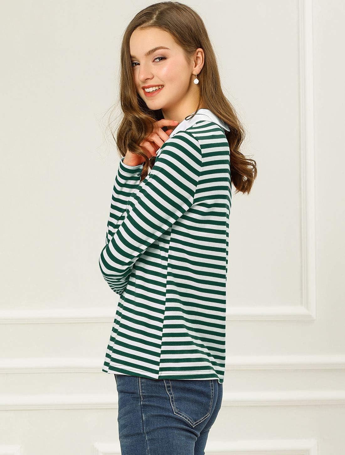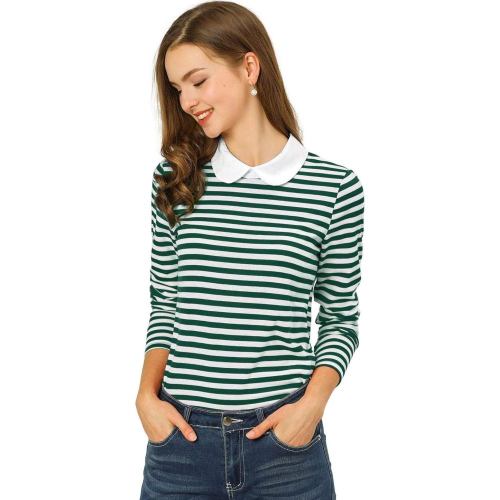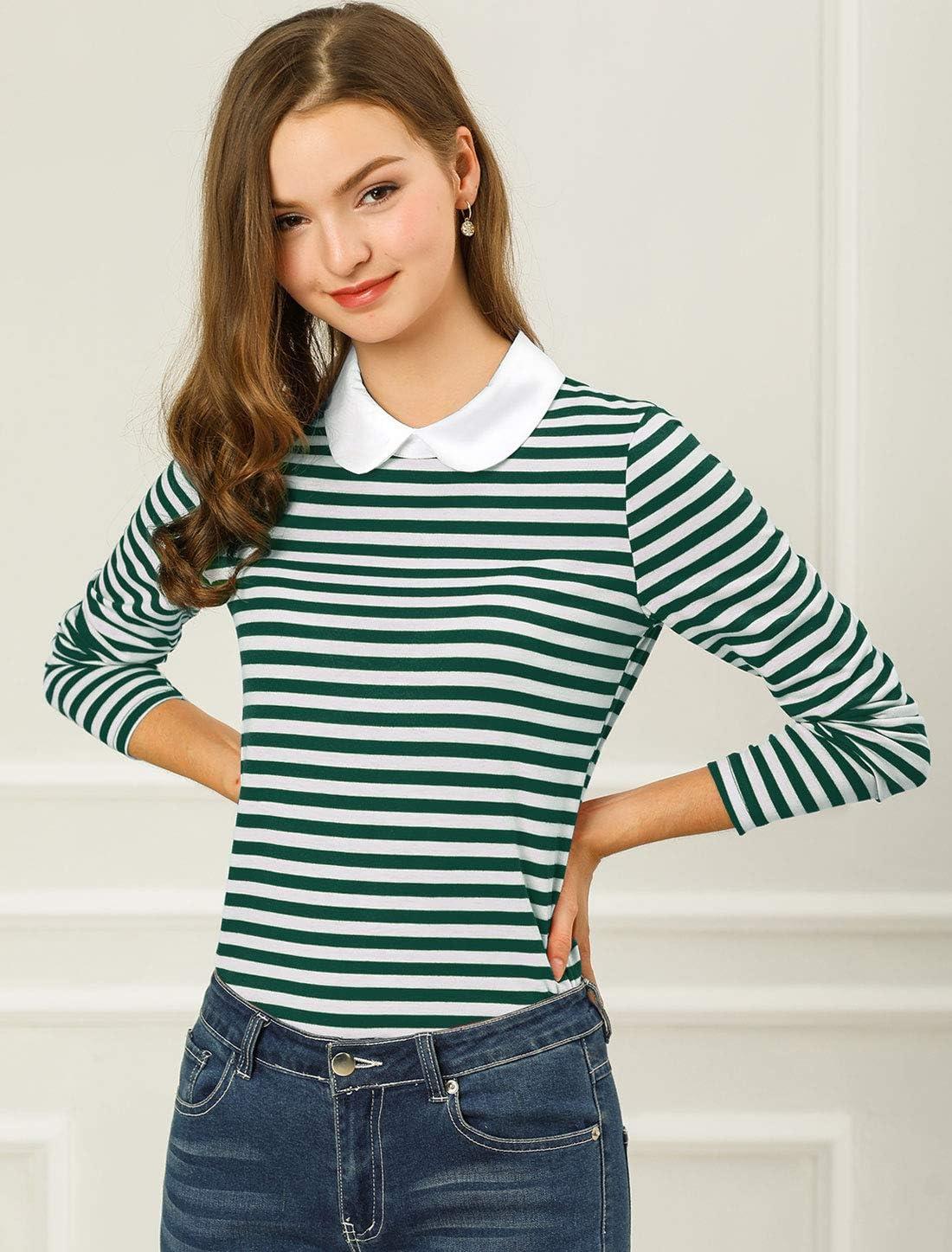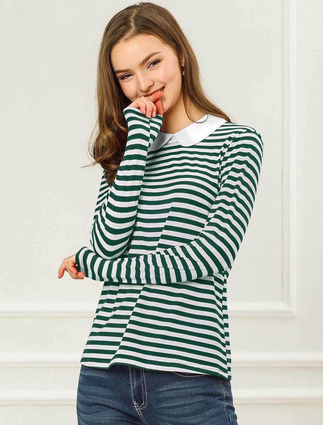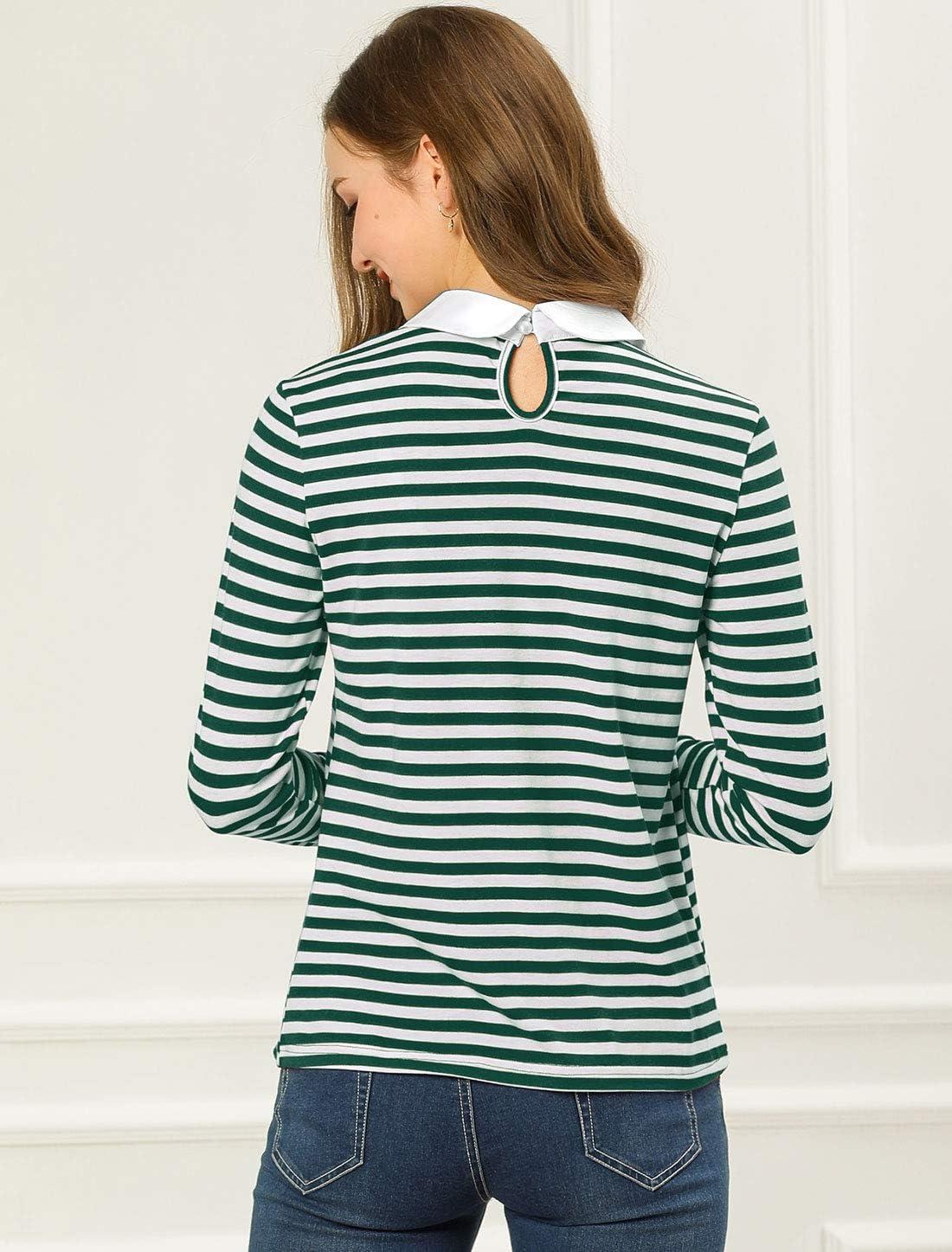Allegra K Women’s Contrast Collar Long Sleeves Peter Pan Collar Halloween Striped Blouse Top(Green)