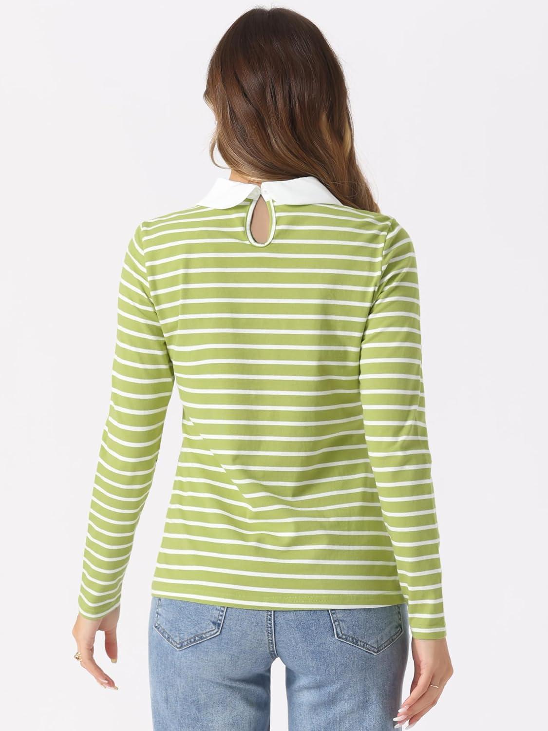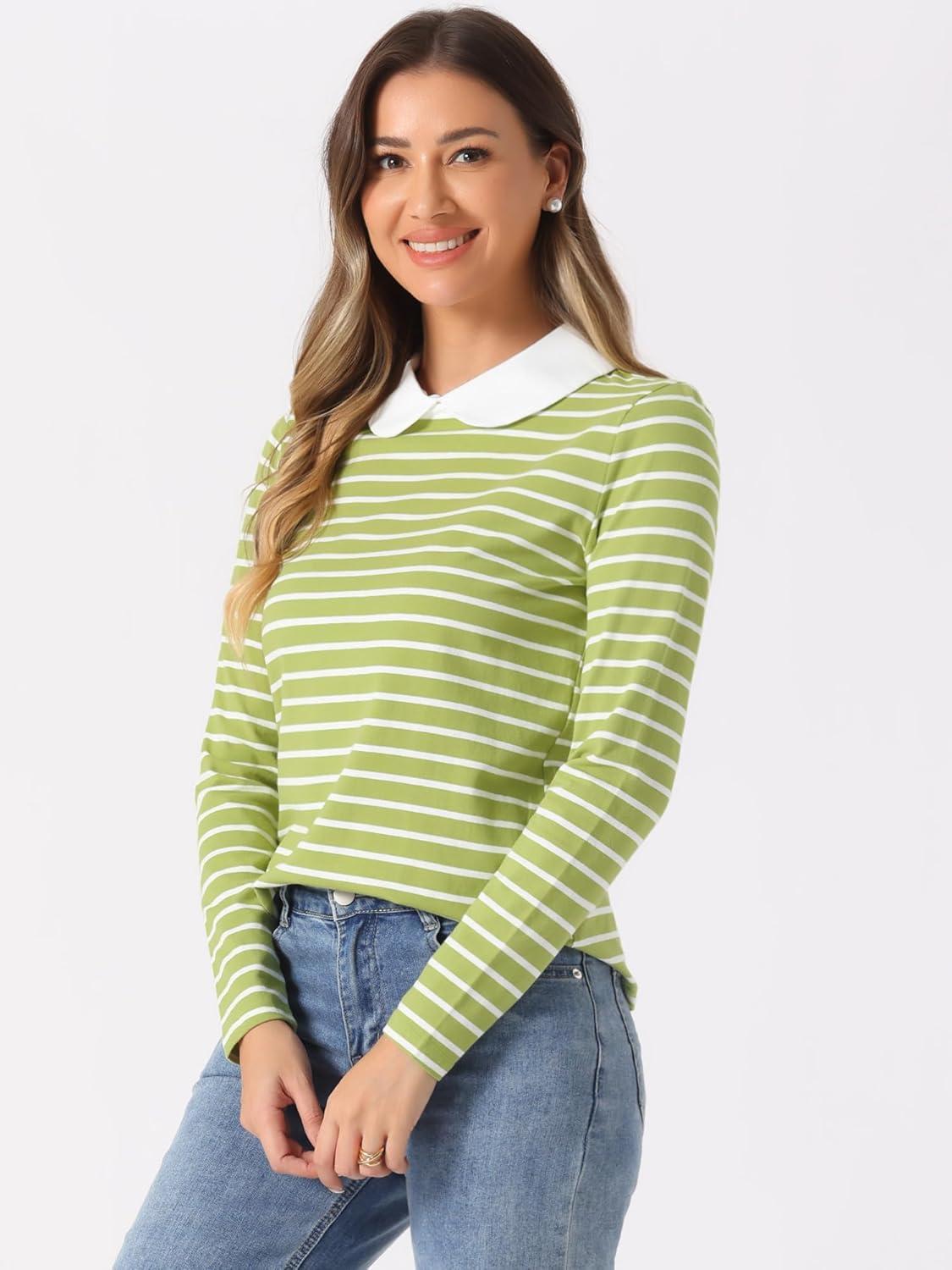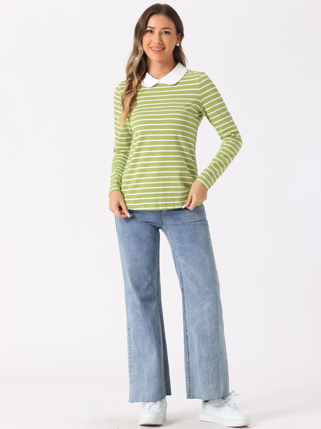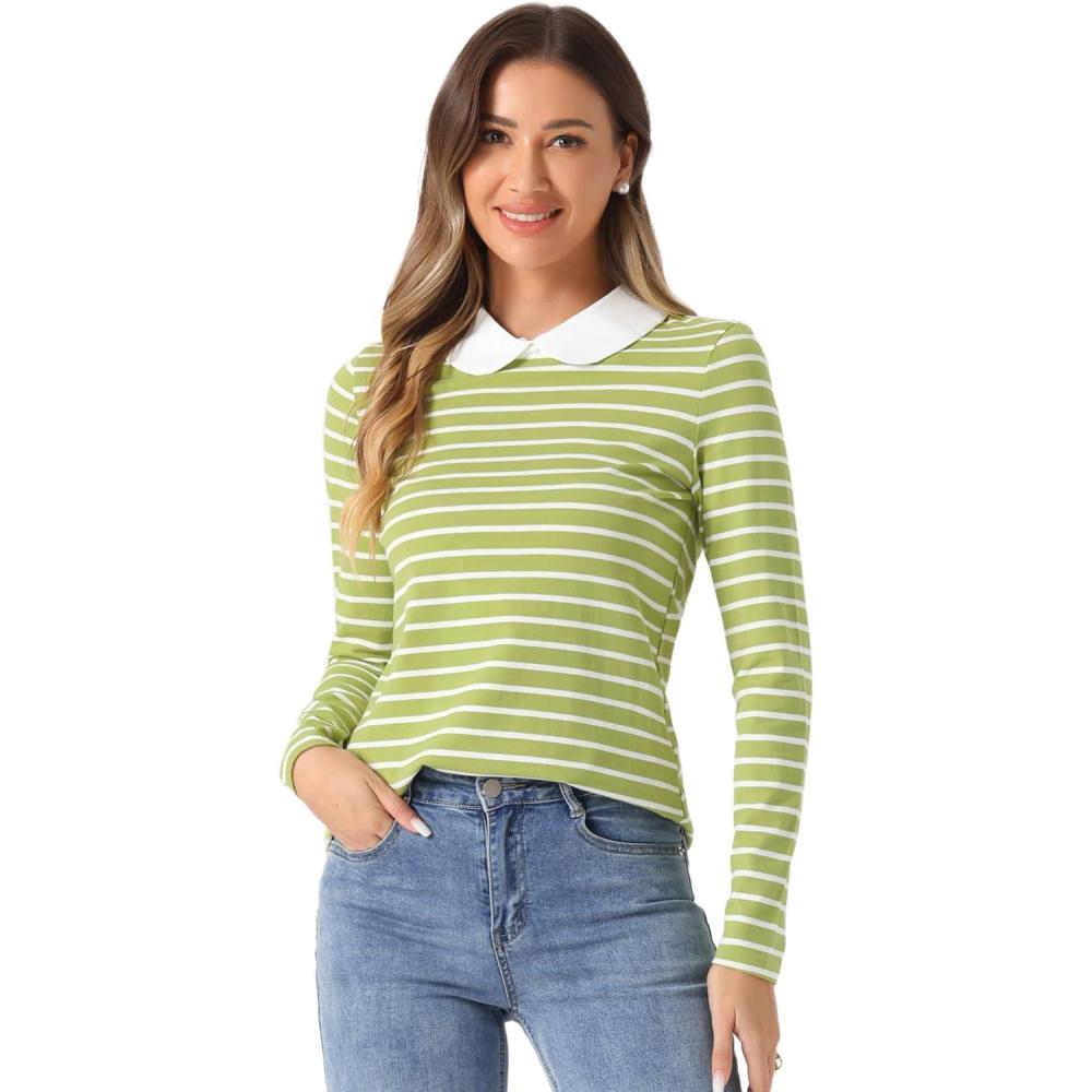 Allegra K Women’s Contrast Collar Long Sleeves Peter Pan Collar Halloween Striped Blouse Top(Light Green)