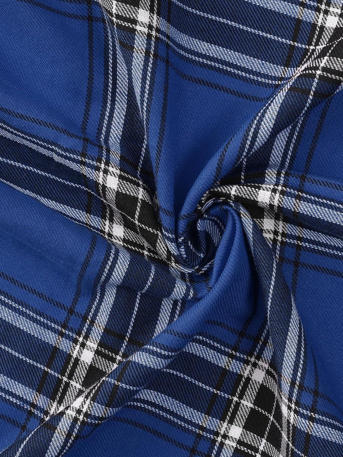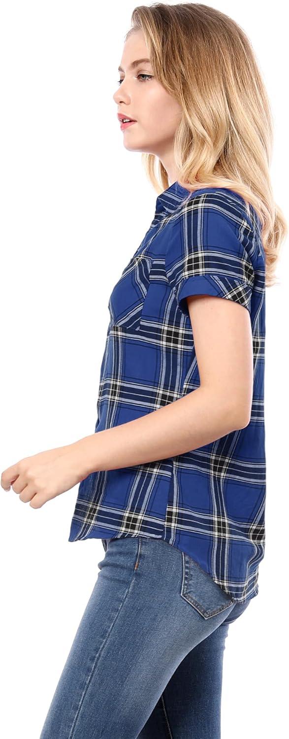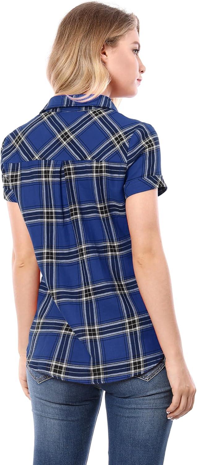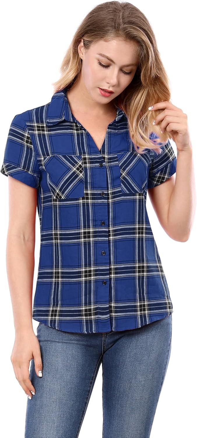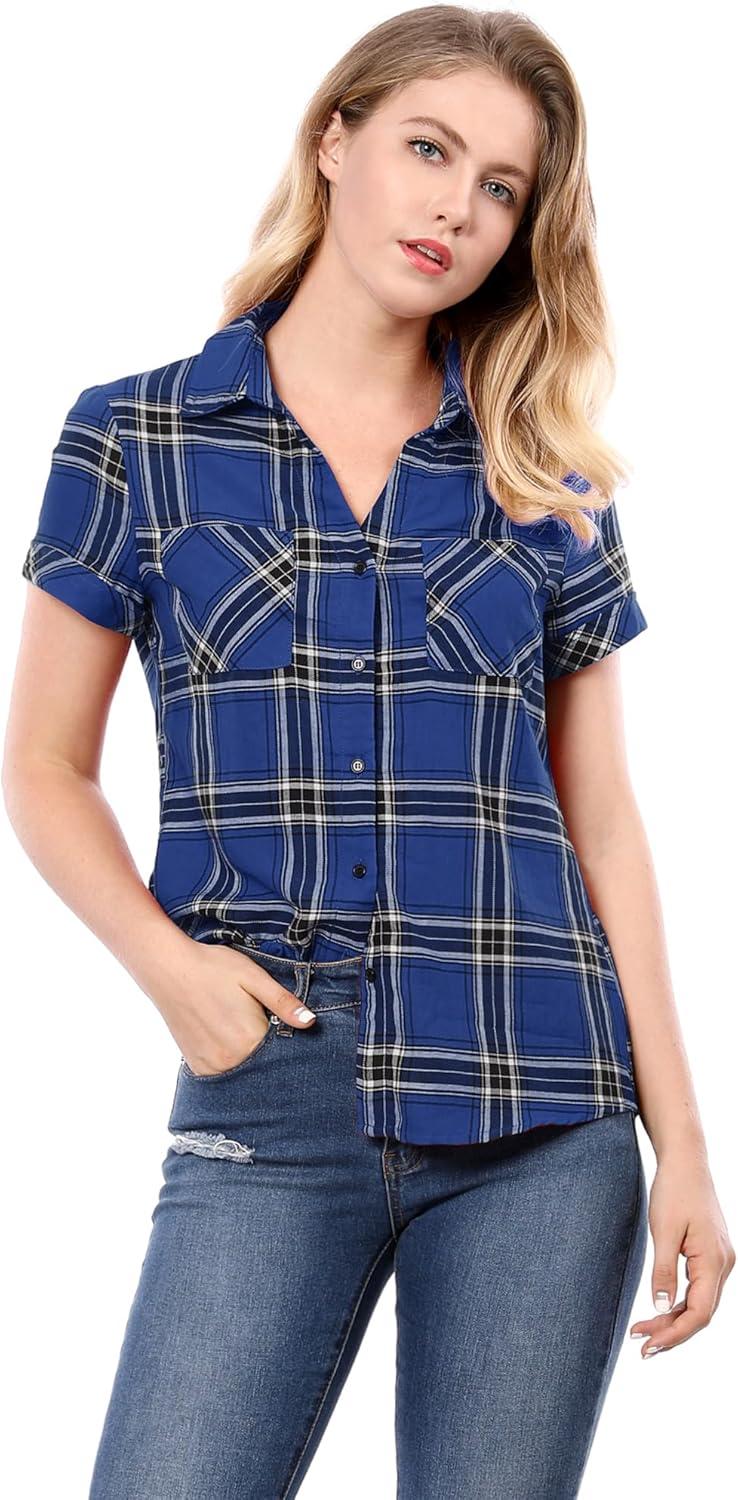Allegra K Women’s Cotton Classic Button Down Western Plaid Shirt(Blue)