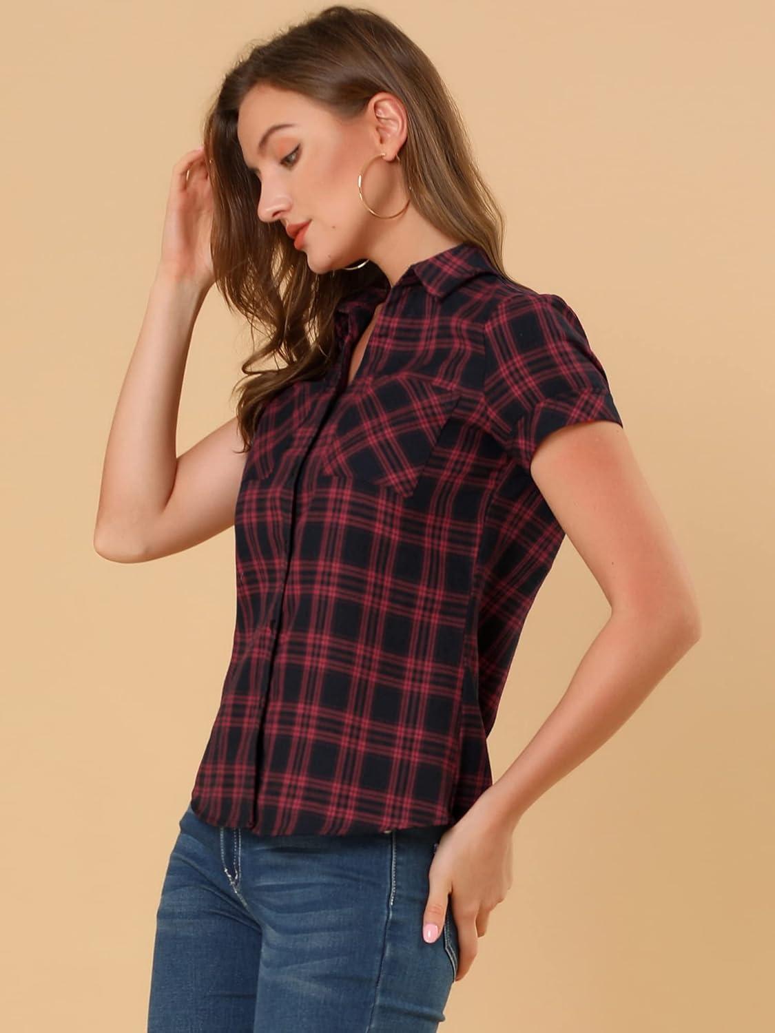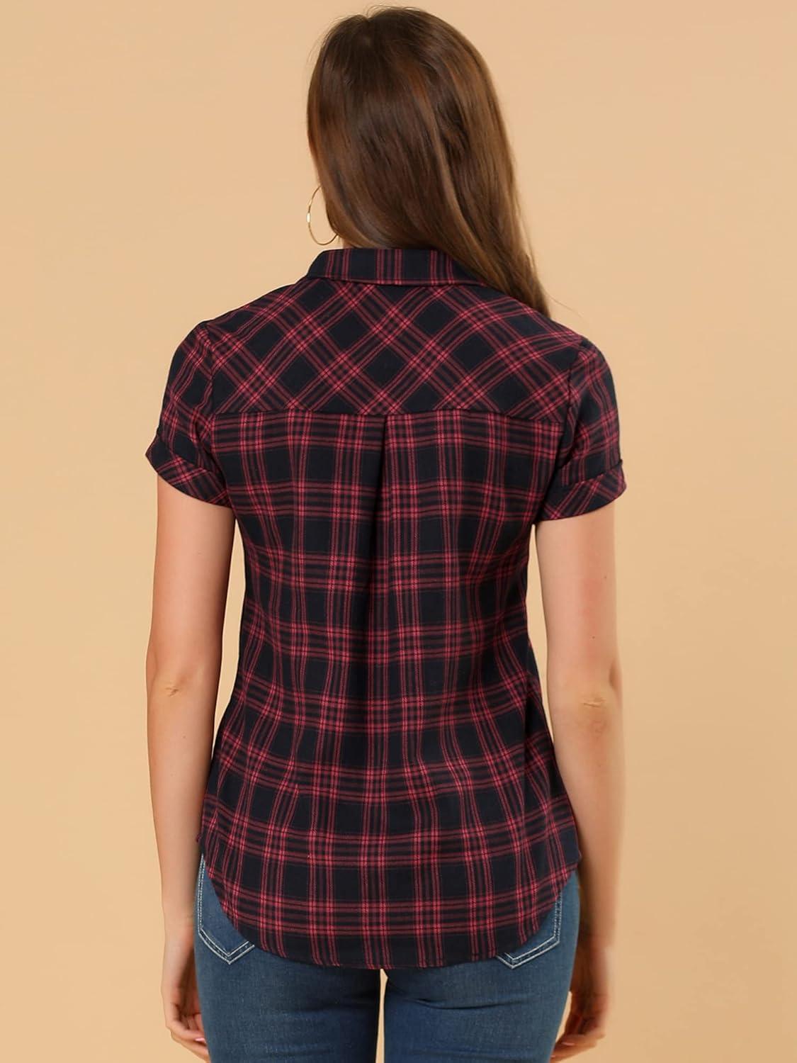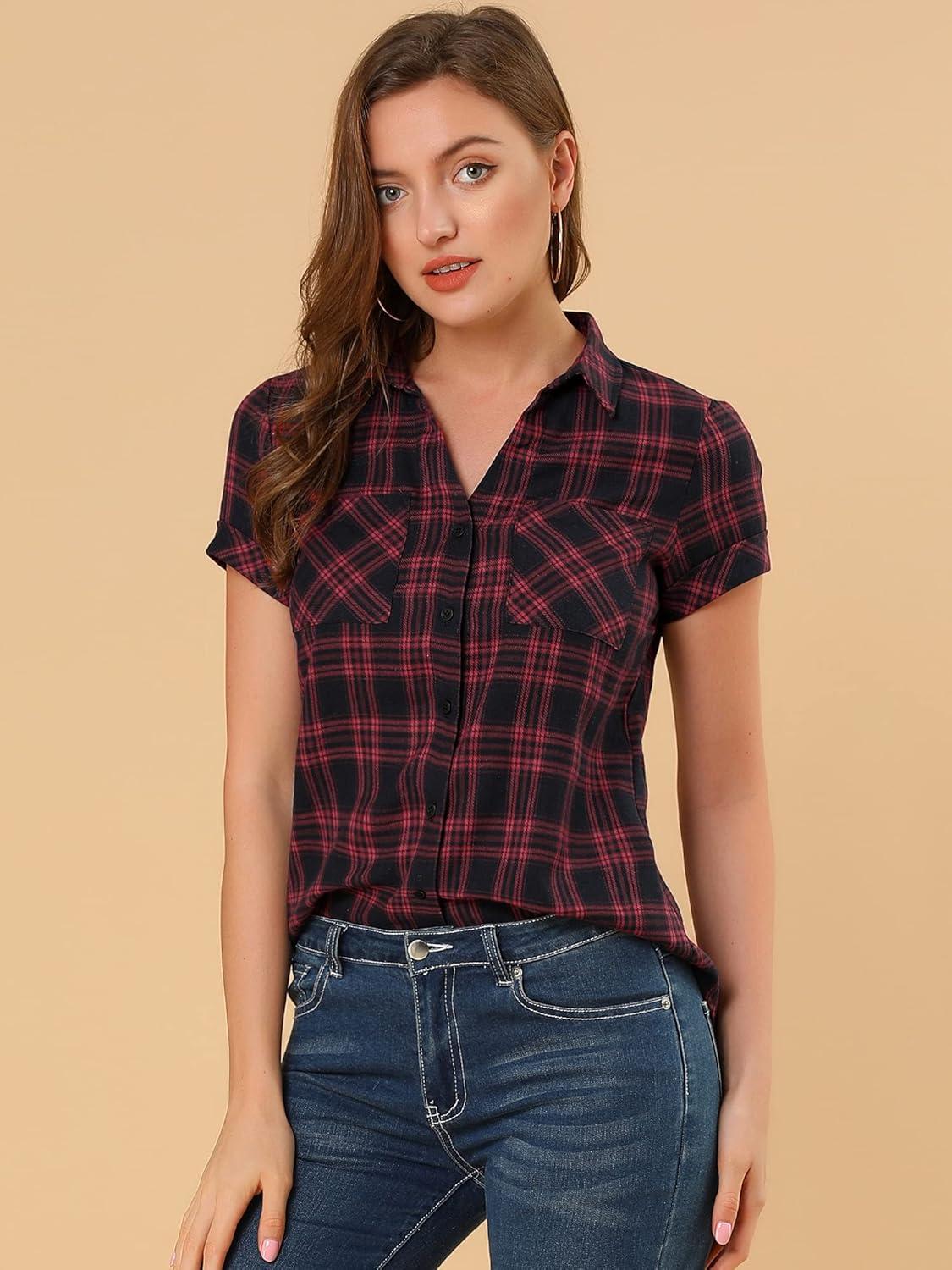 Allegra K Women’s Cotton Classic Button Down Western Plaid Shirt(Red Black)