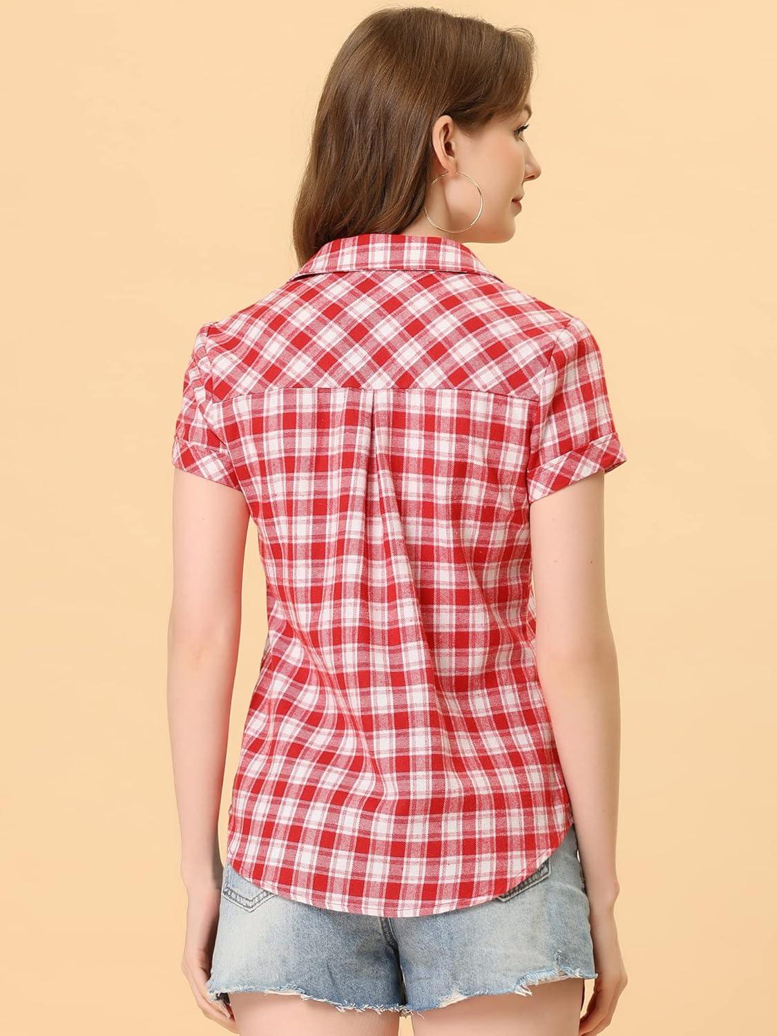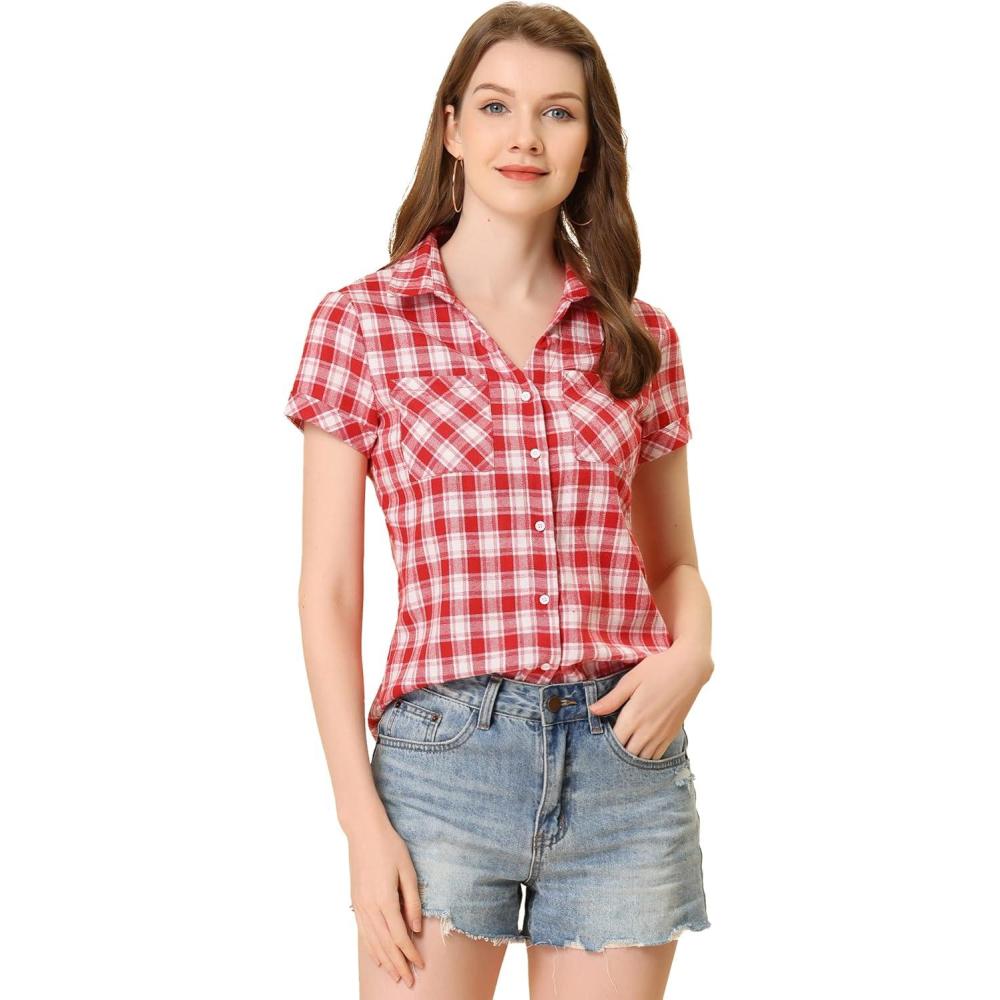 Allegra K Women’s Cotton Classic Button Down Western Plaid Shirt(Red White)