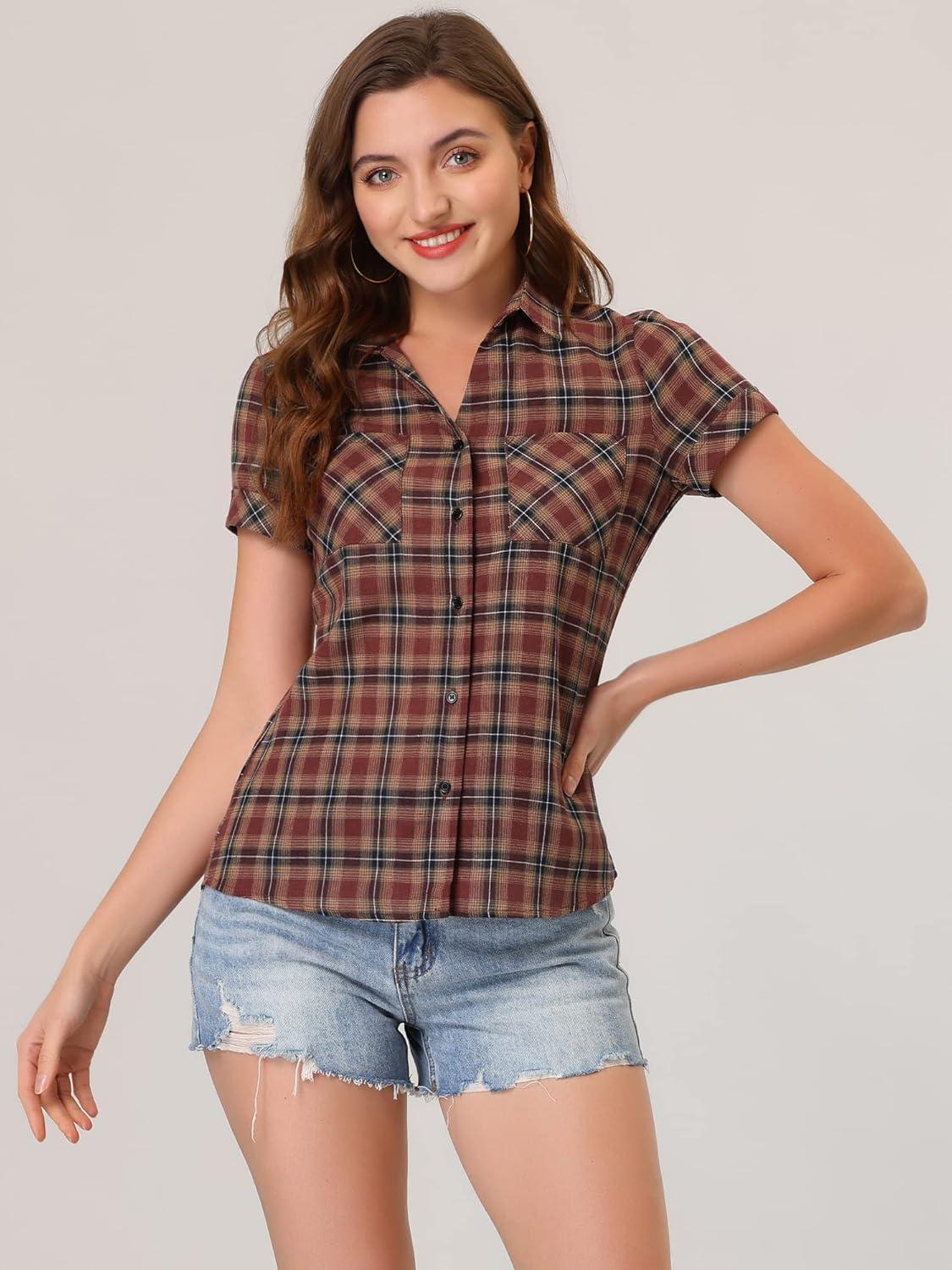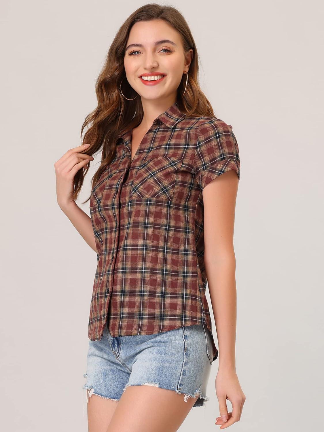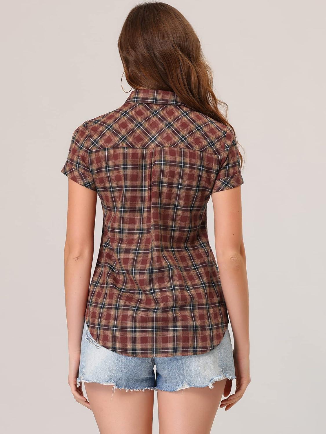 Allegra K Women’s Cotton Classic Button Down Western Plaid Shirt(Red White)