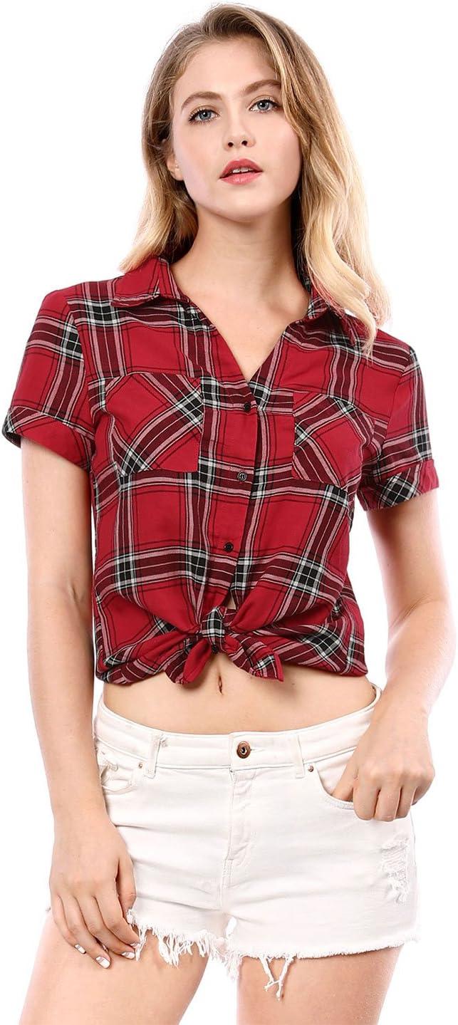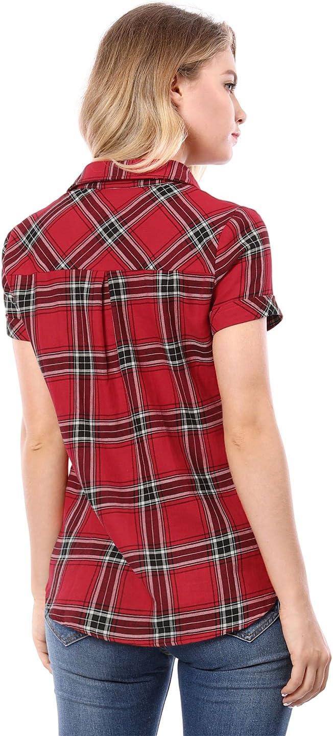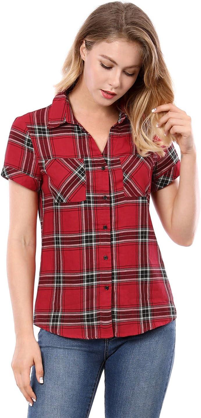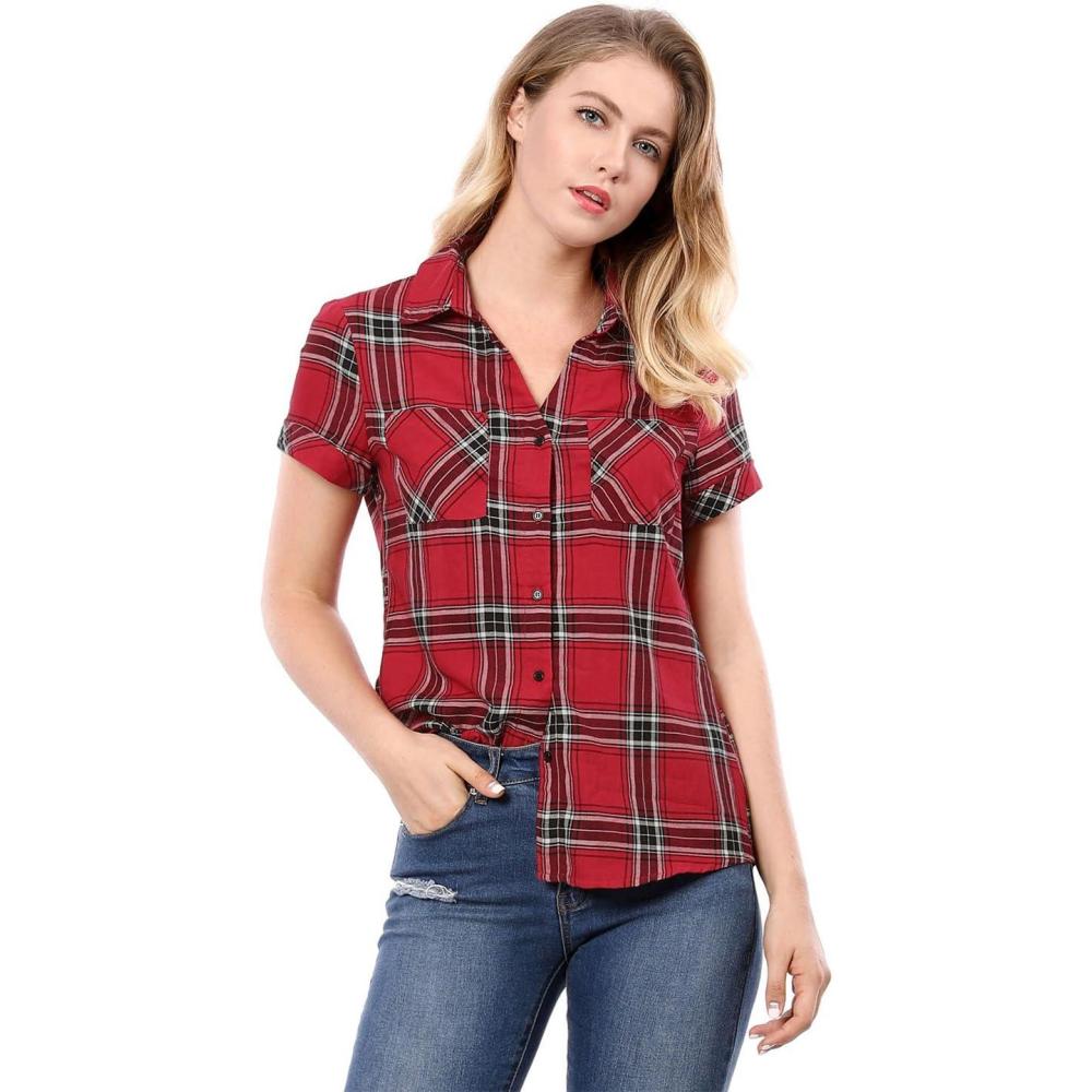 Allegra K Women’s Cotton Classic Button Down Western Plaid Shirt(Red)