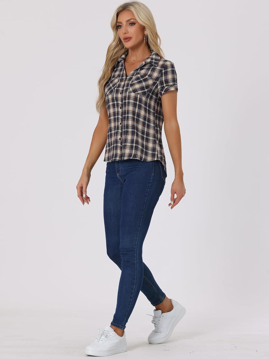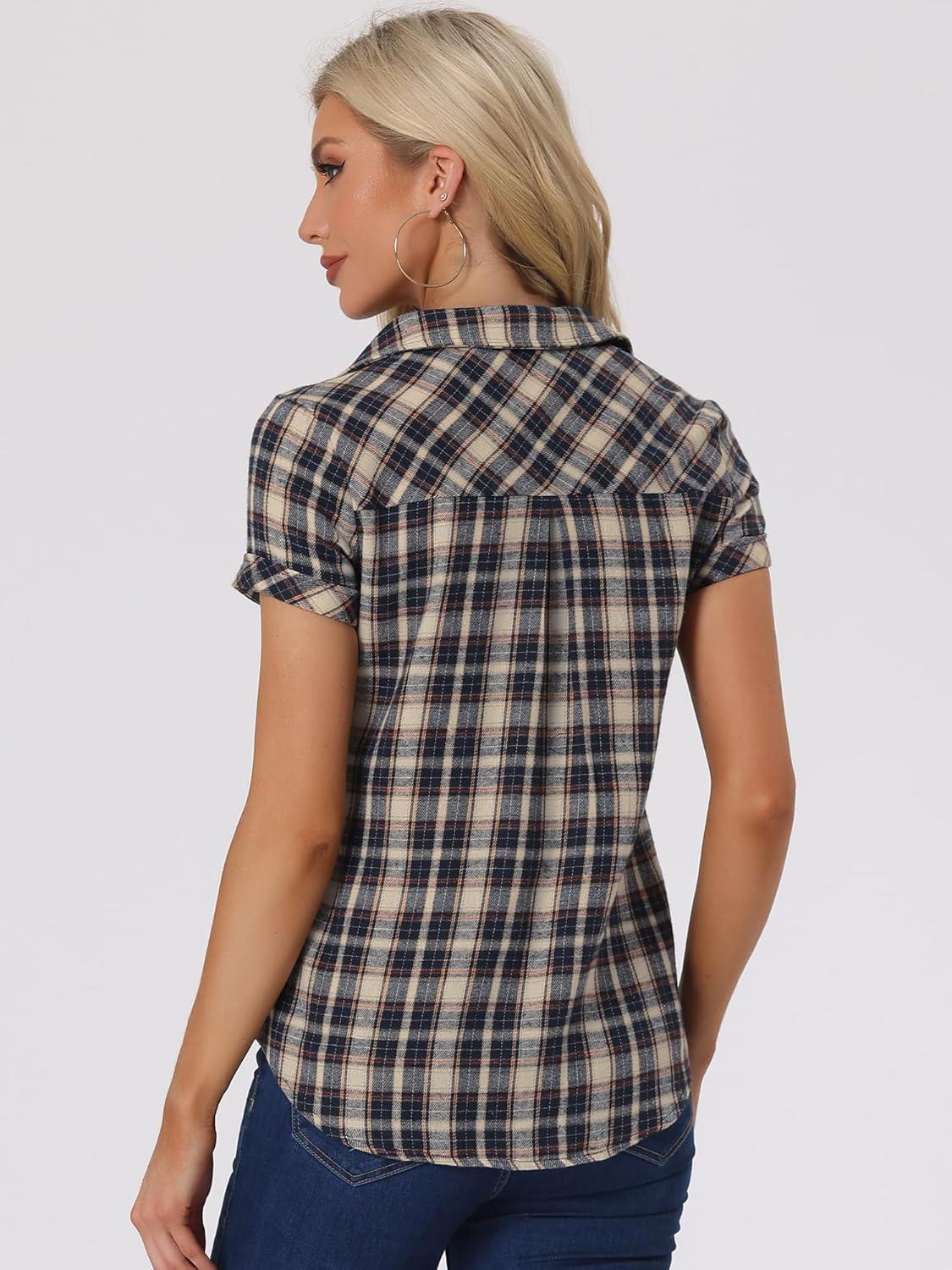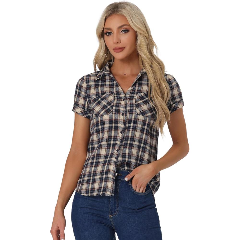 Allegra K Women’s Cotton Classic Button Down Western Plaid Shirt(Dark Blue)