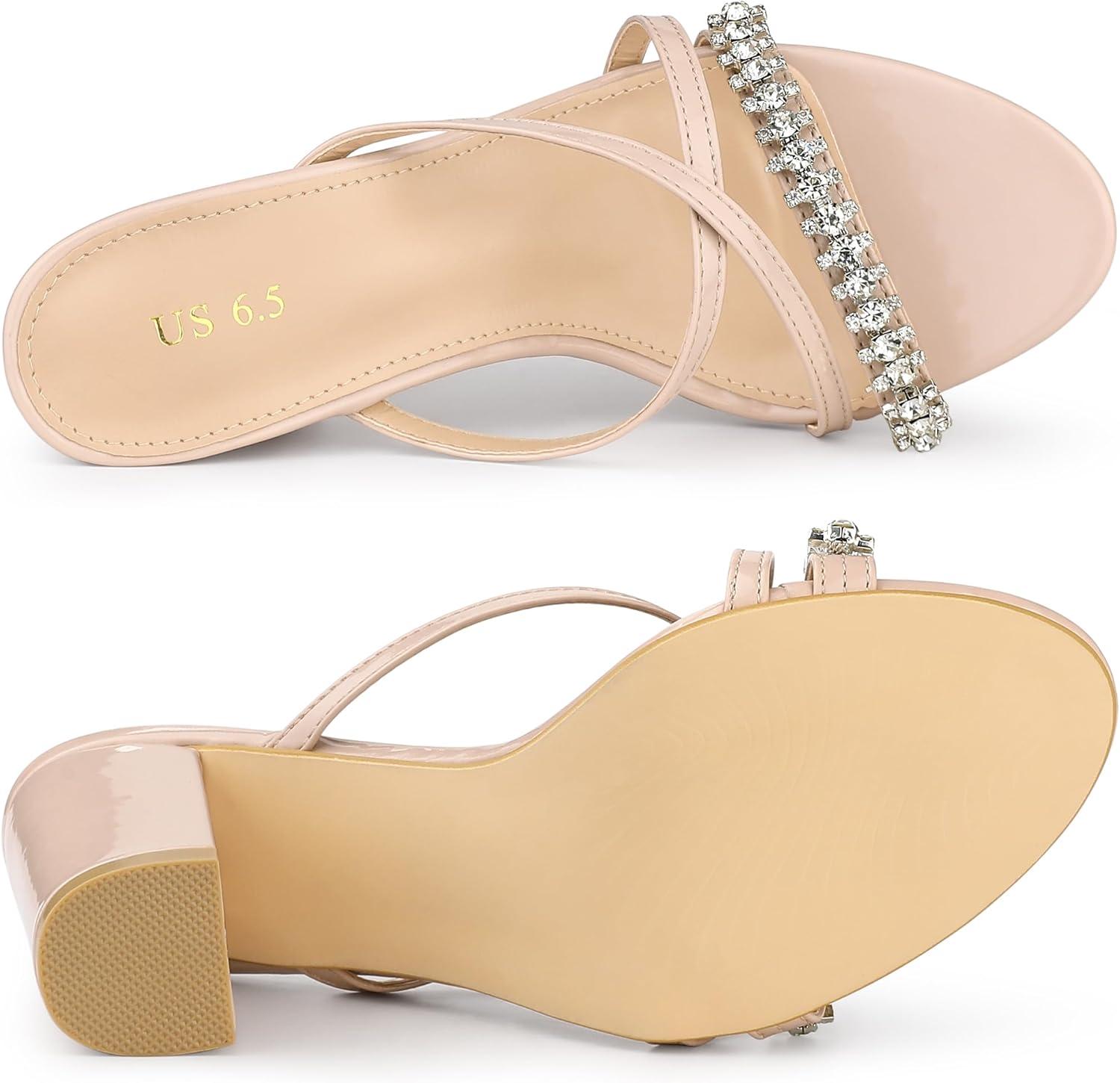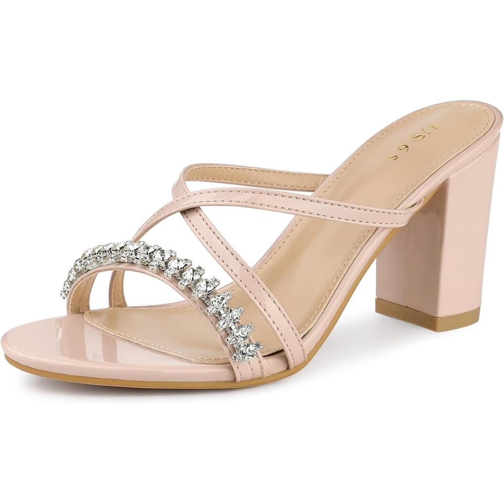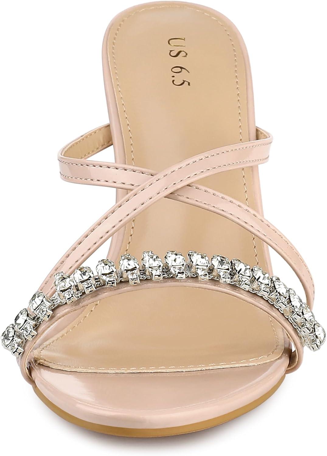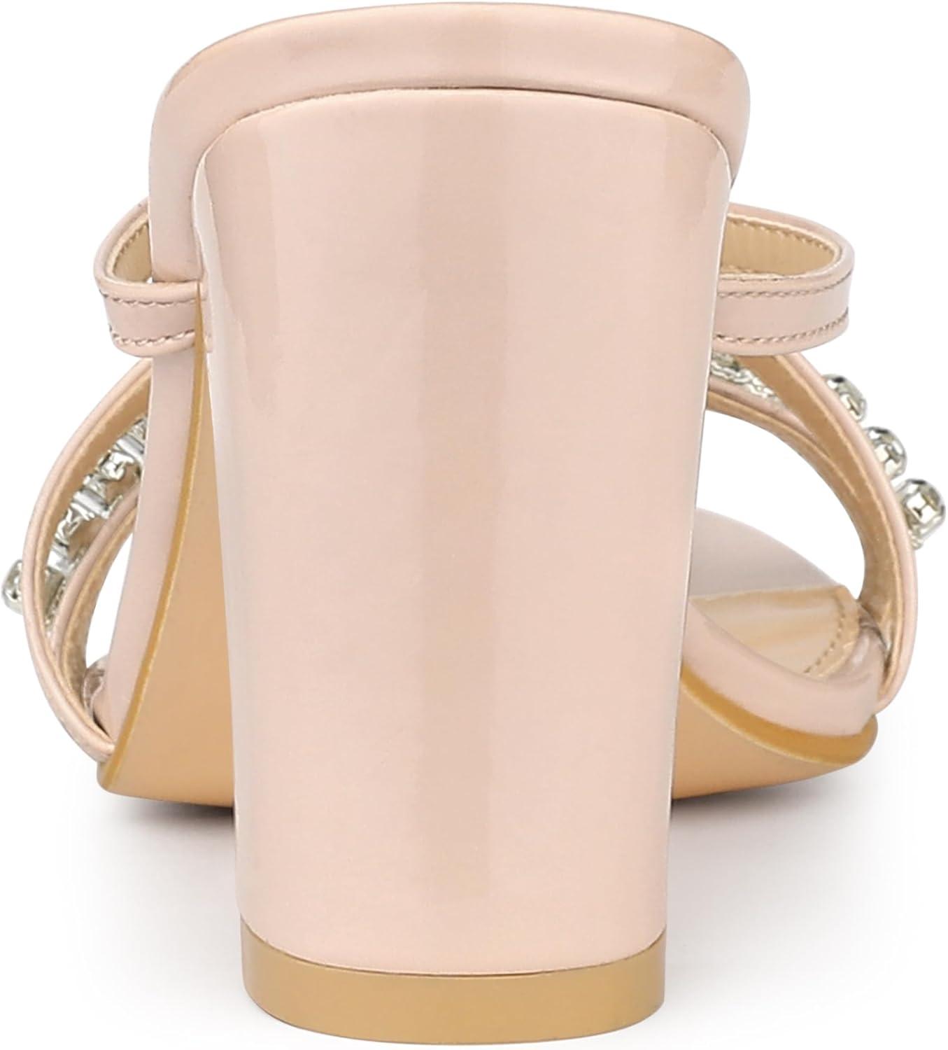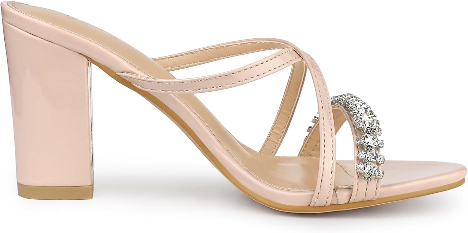 Allegra K Women’s Crisscross Strap Rhinestone Block Heel Slide Sandals(Beige)