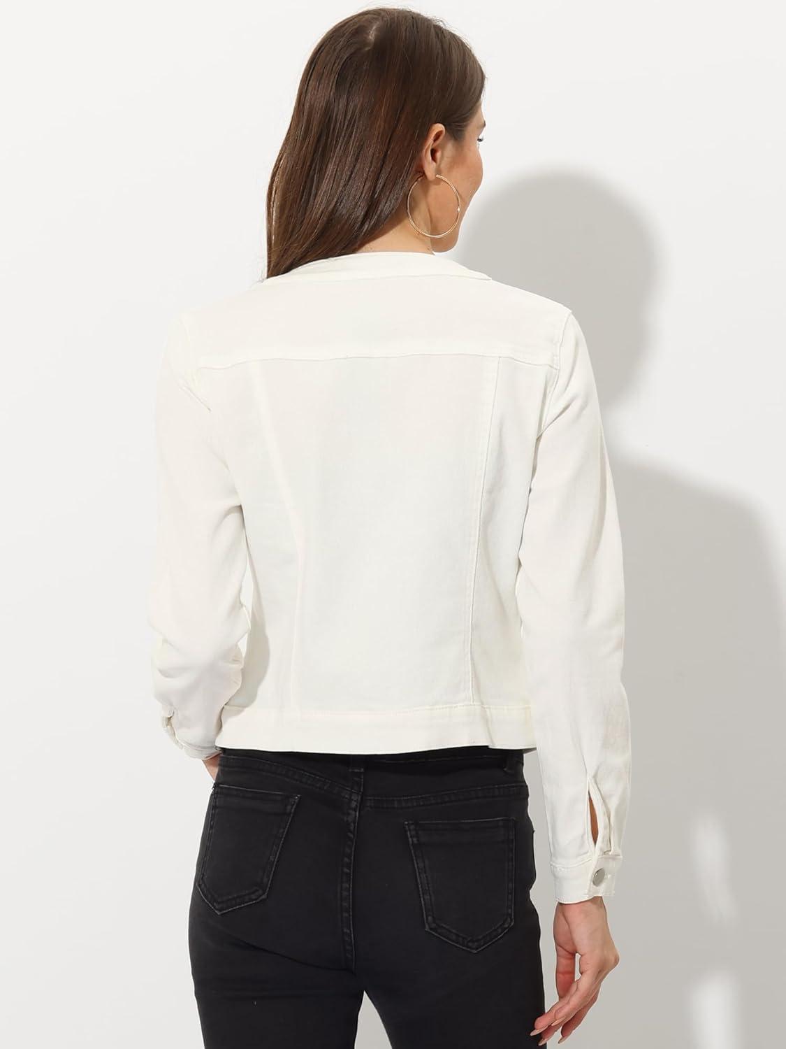Allegra K Women’s Denim Jacket Collarless Round Neck Button Down Long Sleeve Jean Jackets(White)