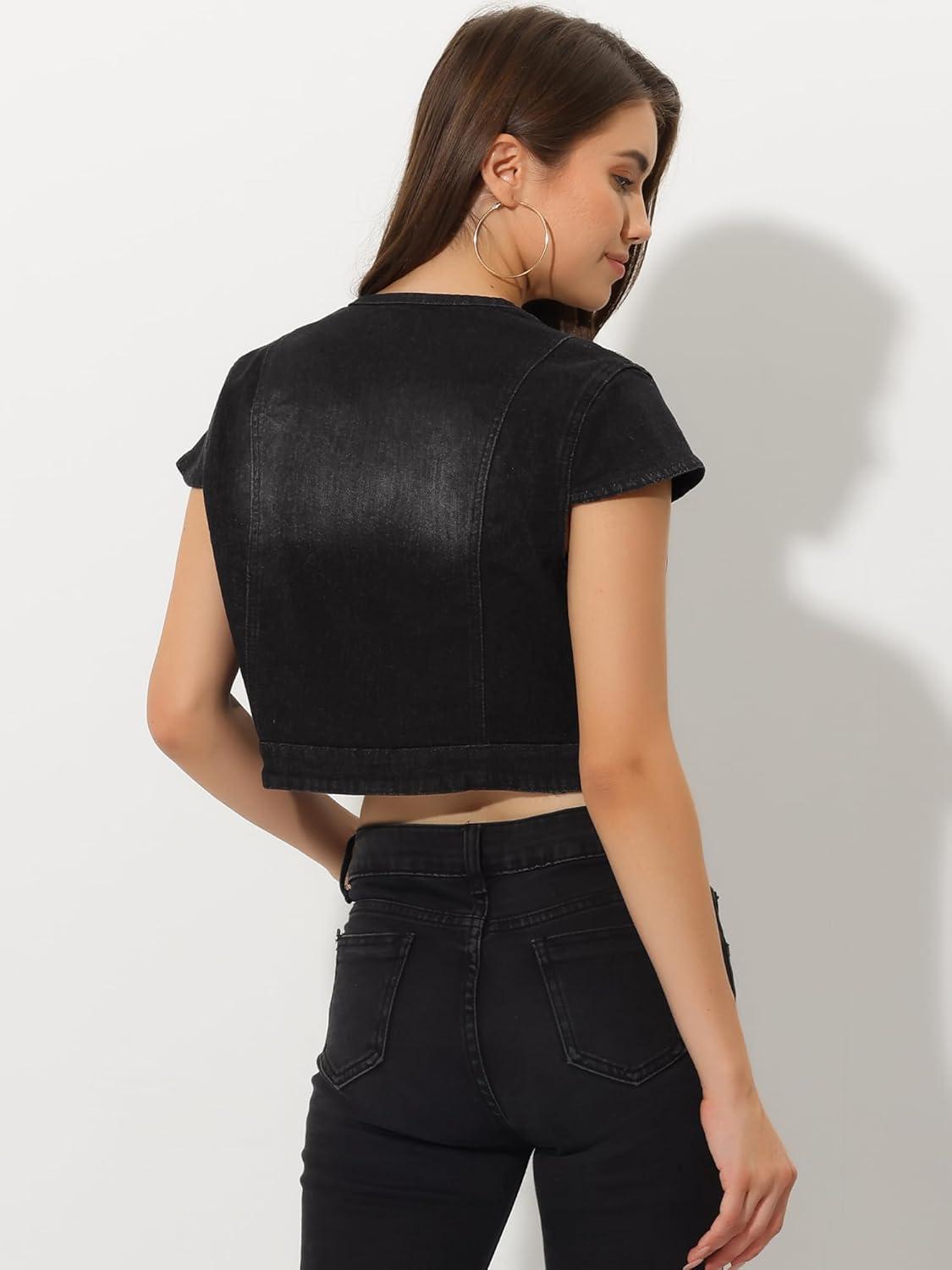 Allegra K Women's Denim Jacket Short Sleeve Jean Jacket Slim Fit Summer Outfits Casual Cropped Jacket(Black)
