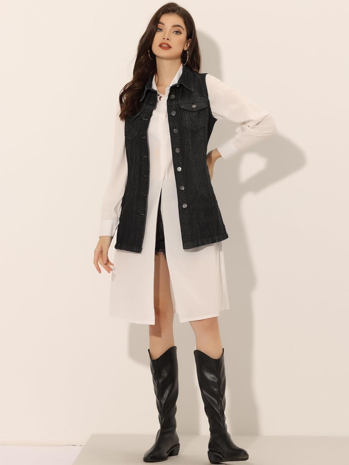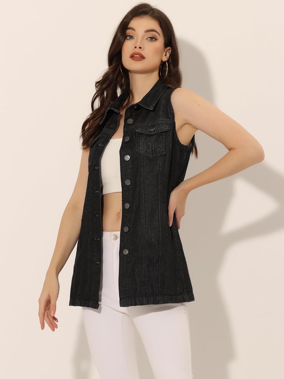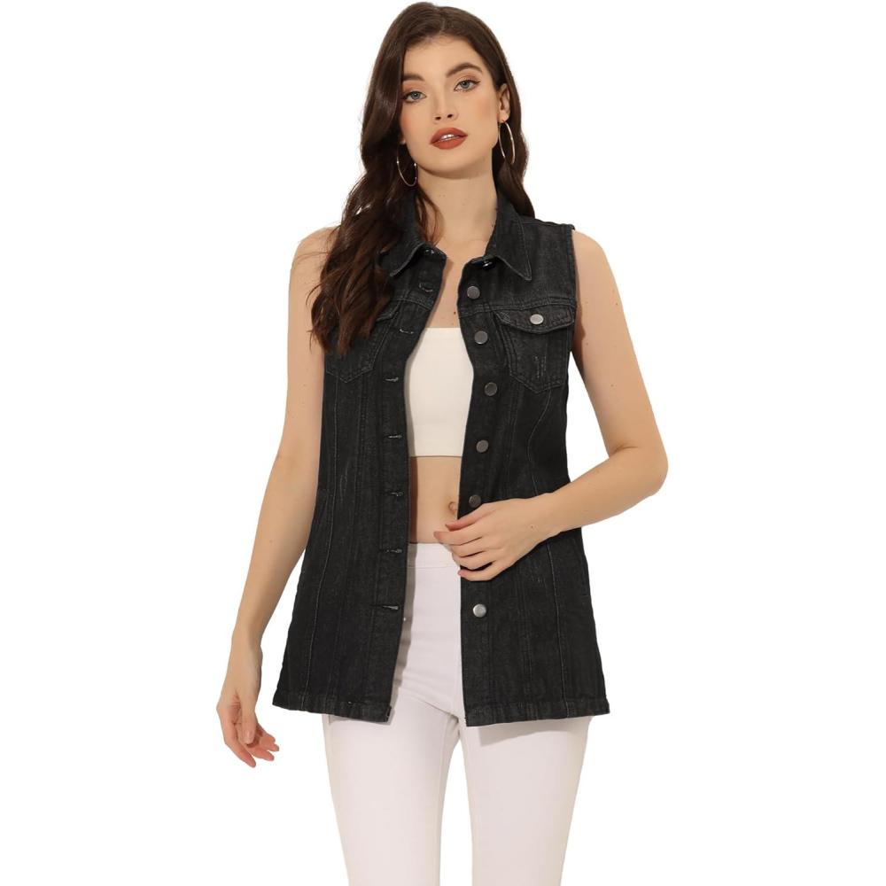 Allegra K Women’s Denim Vest Sleeveless Button Down Waistcoat Casual Long Jean Vests(Black)