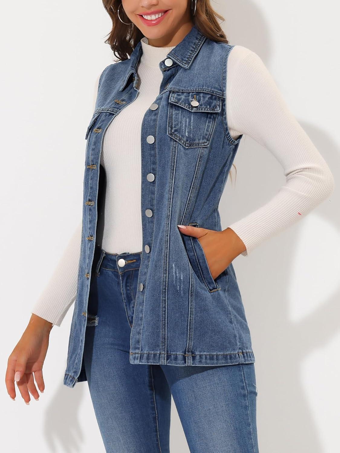 Allegra K Women’s Denim Vest Sleeveless Button Down Waistcoat Casual Long Jean Vests(Blue)