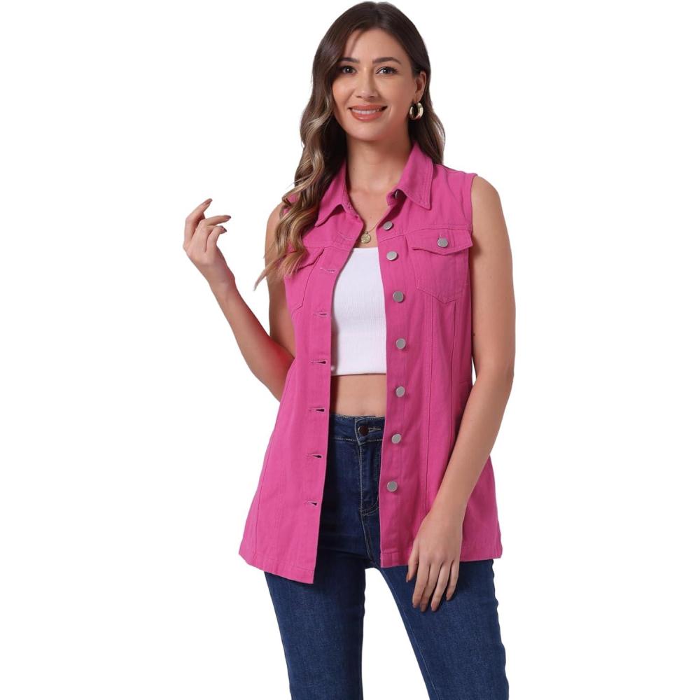 Allegra K Women’s Denim Vest Sleeveless Button Down Waistcoat Casual Long Jean Vests(Hot Pink)