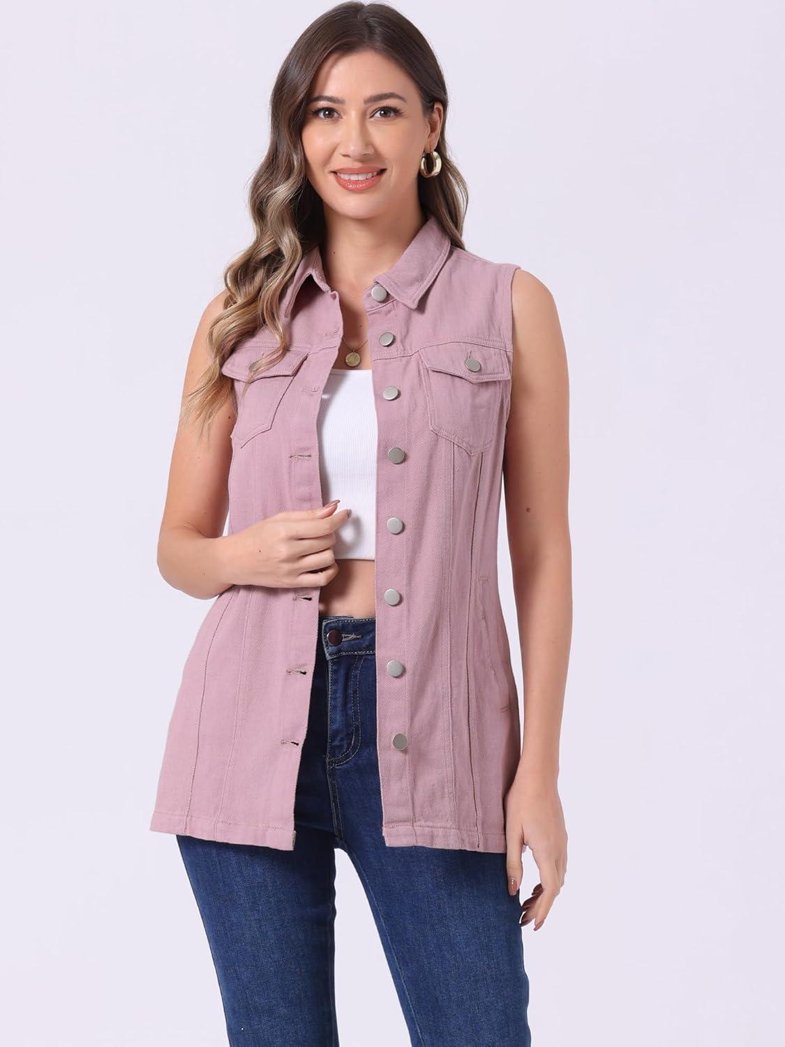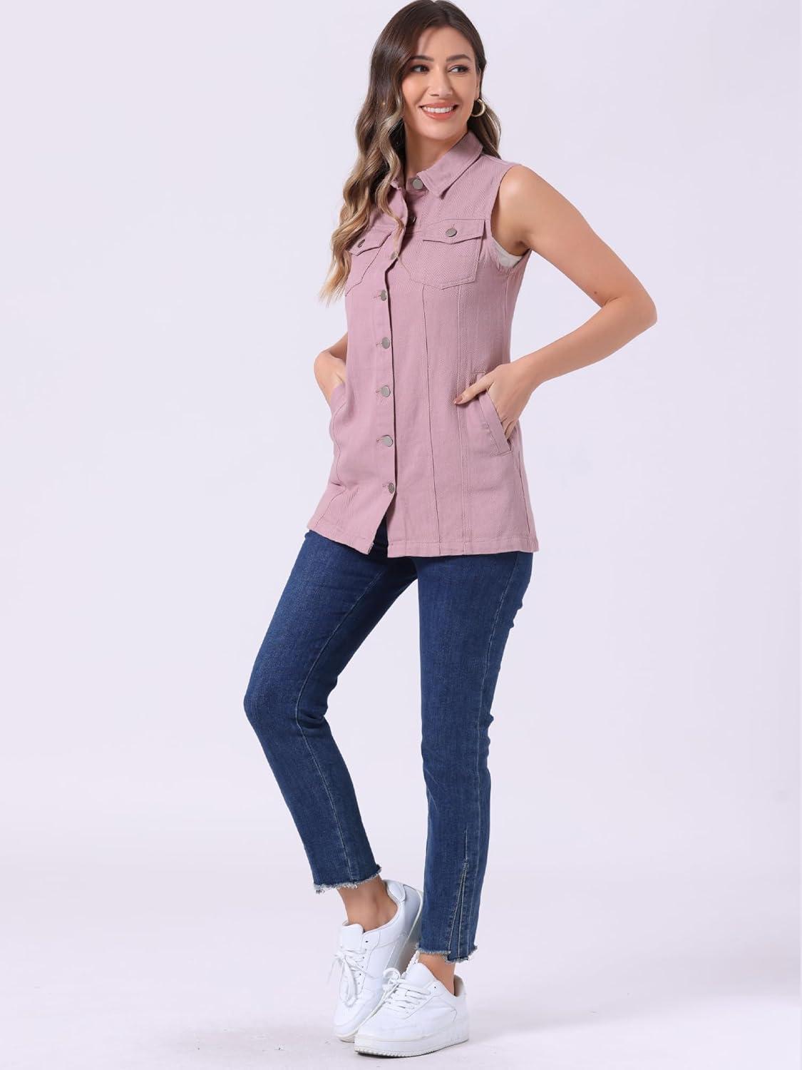 Allegra K Women’s Denim Vest Sleeveless Button Down Waistcoat Casual Long Jean Vests(Pink)