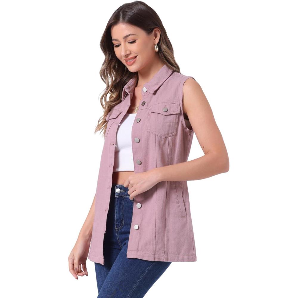 Allegra K Women's Denim Vest Sleeveless Button Down Waistcoat Casual Long Jean Vests(Pink)