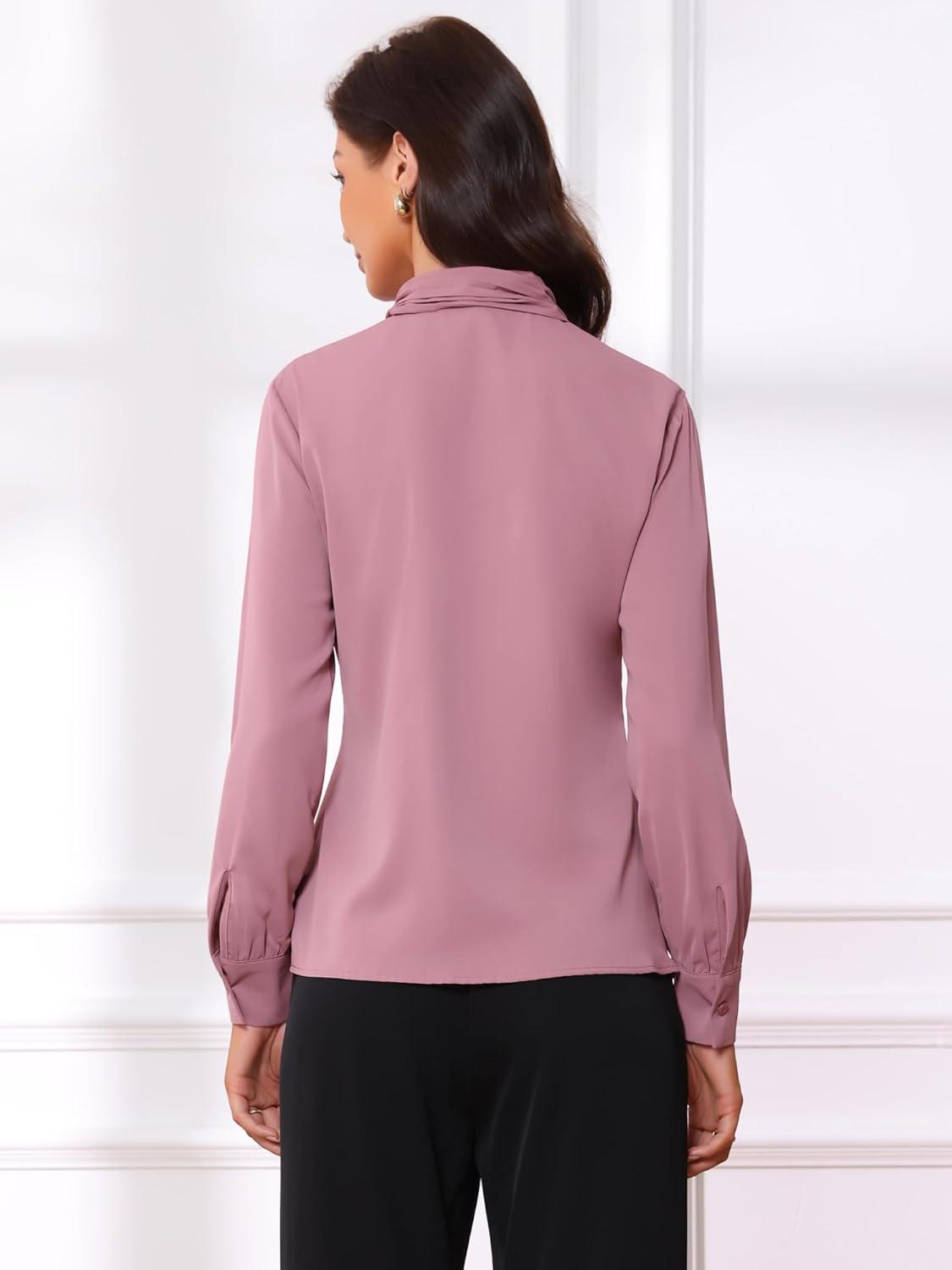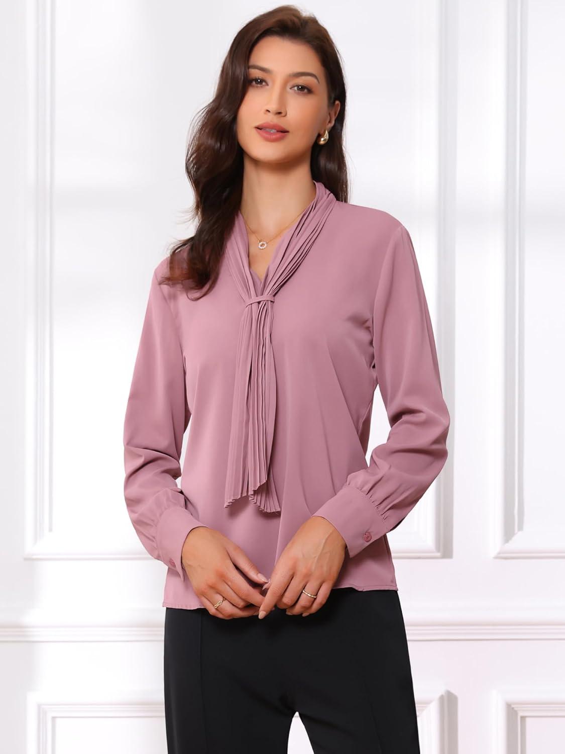 Allegra K Women's Dressy Long Sleeve Blouses Chiffon Pleated Tie Neck Office Top Shirt(Lavender Pink)