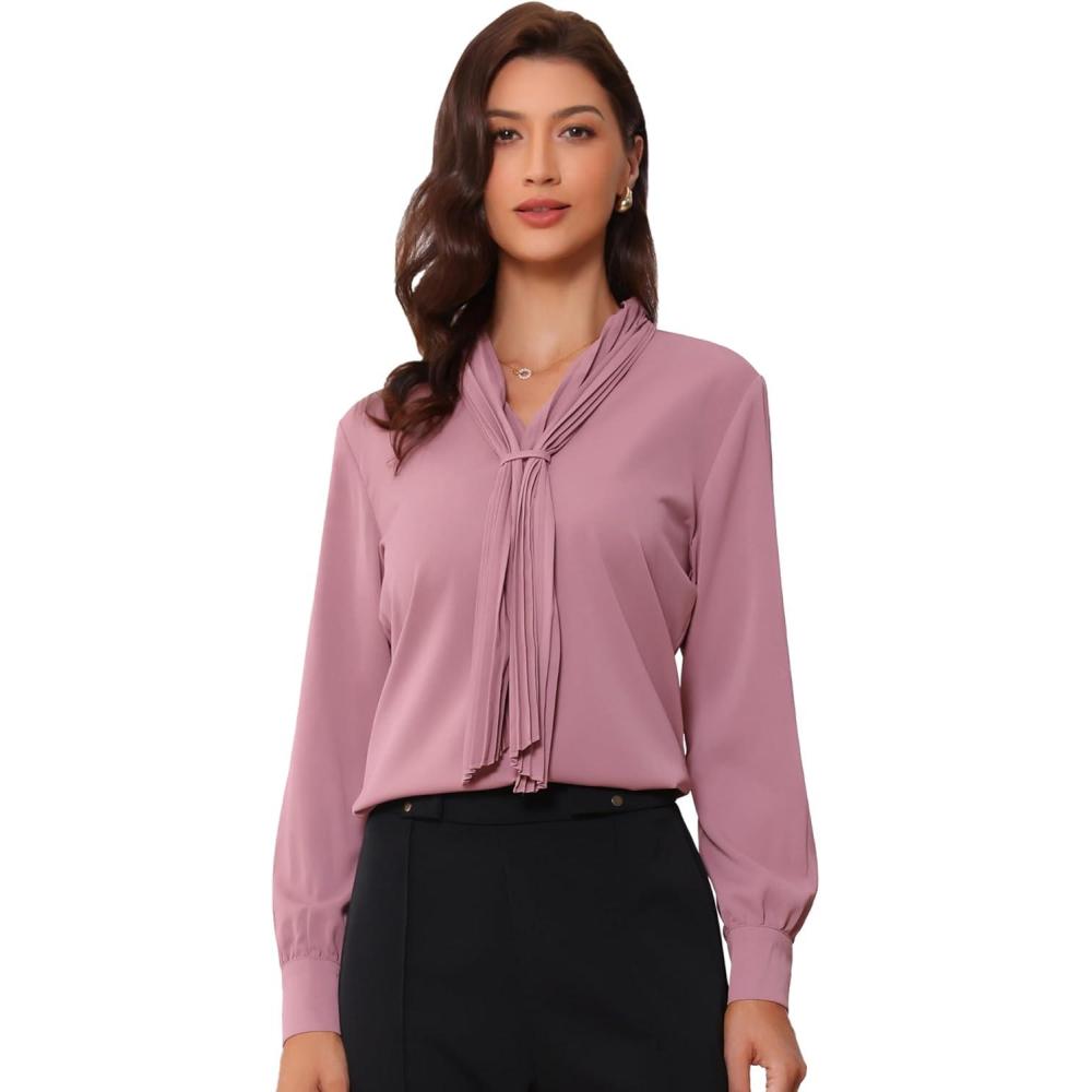 Allegra K Women’s Dressy Long Sleeve Blouses Chiffon Pleated Tie Neck Office Top Shirt(Lavender Pink)
