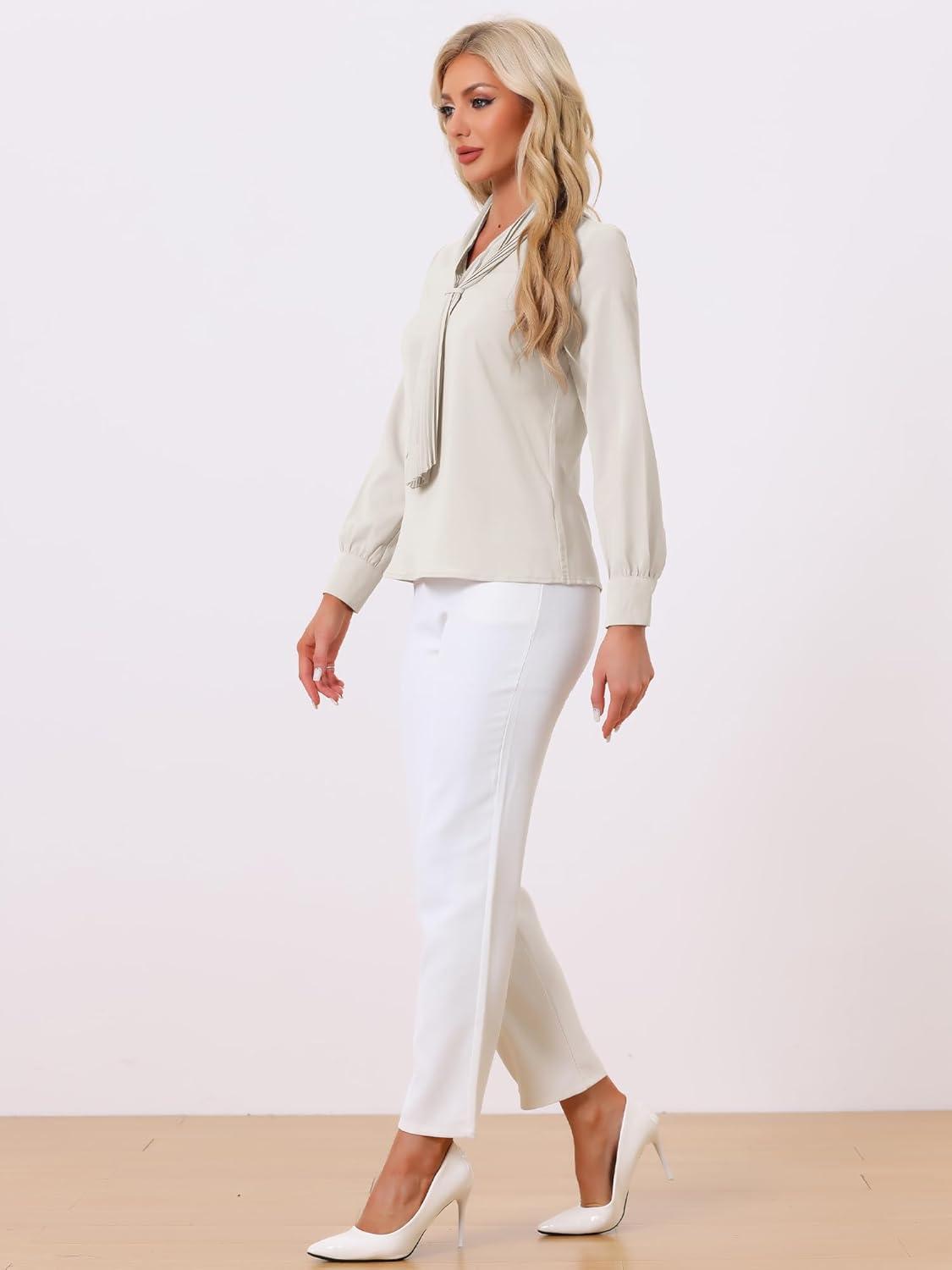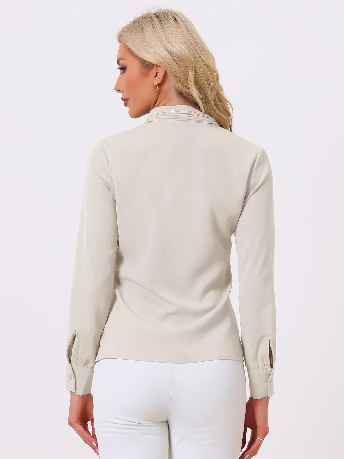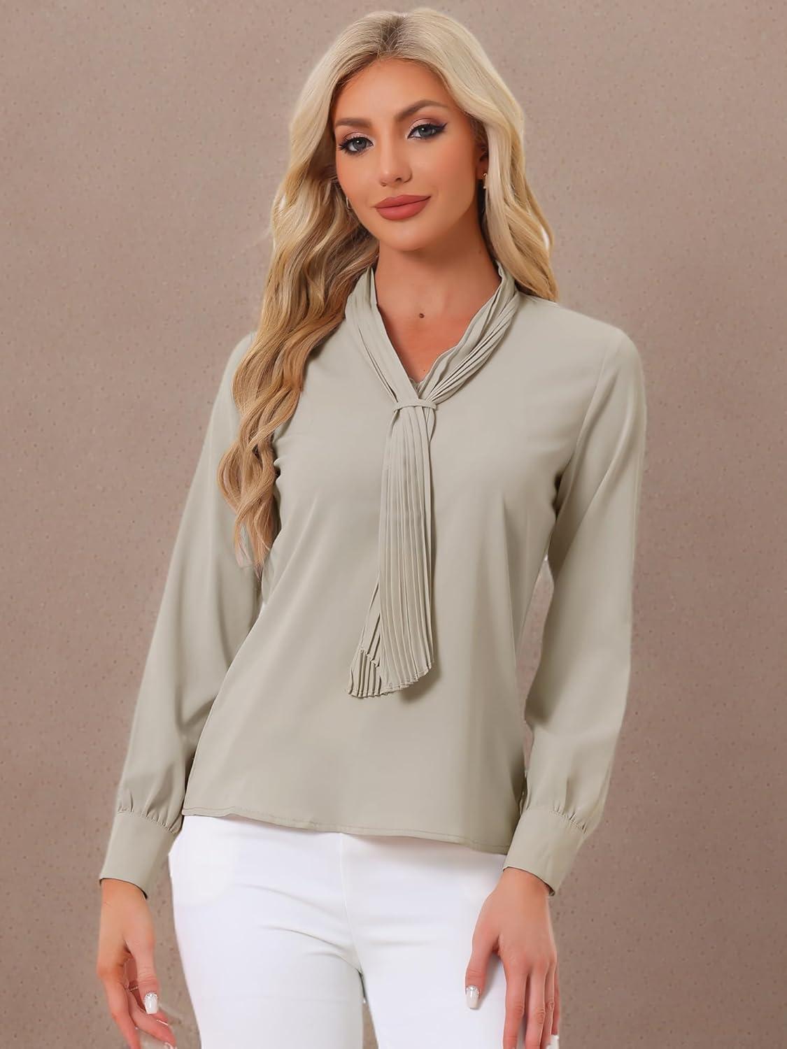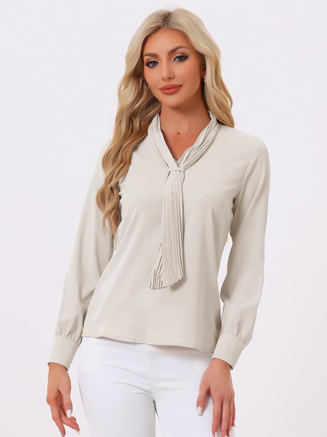 Allegra K Women’s Dressy Long Sleeve Blouses Chiffon Pleated Tie Neck Office Top Shirt(Light Beige)