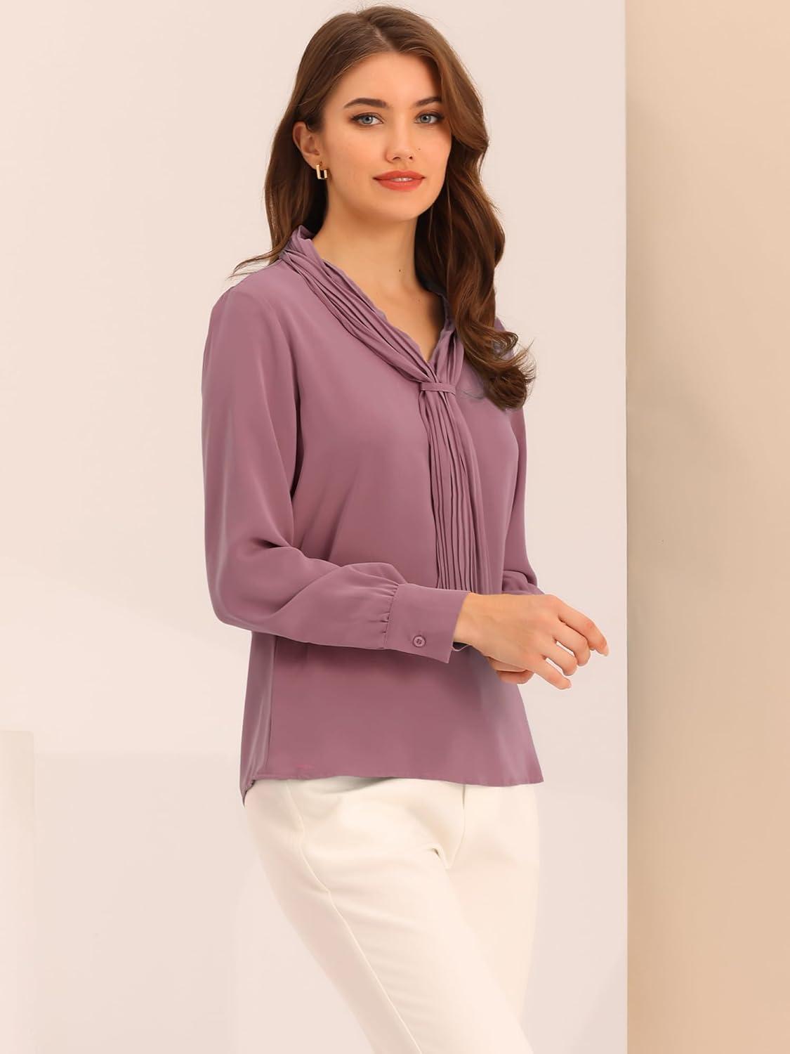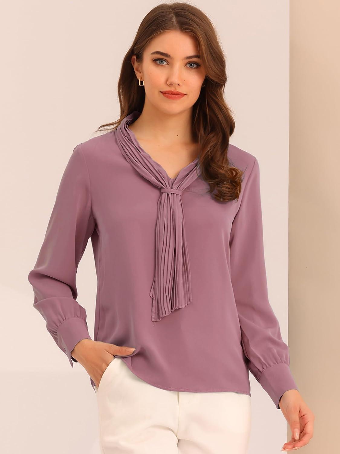 Allegra K Women’s Dressy Long Sleeve Blouses Chiffon Pleated Tie Neck Office Top Shirt(Mauve)