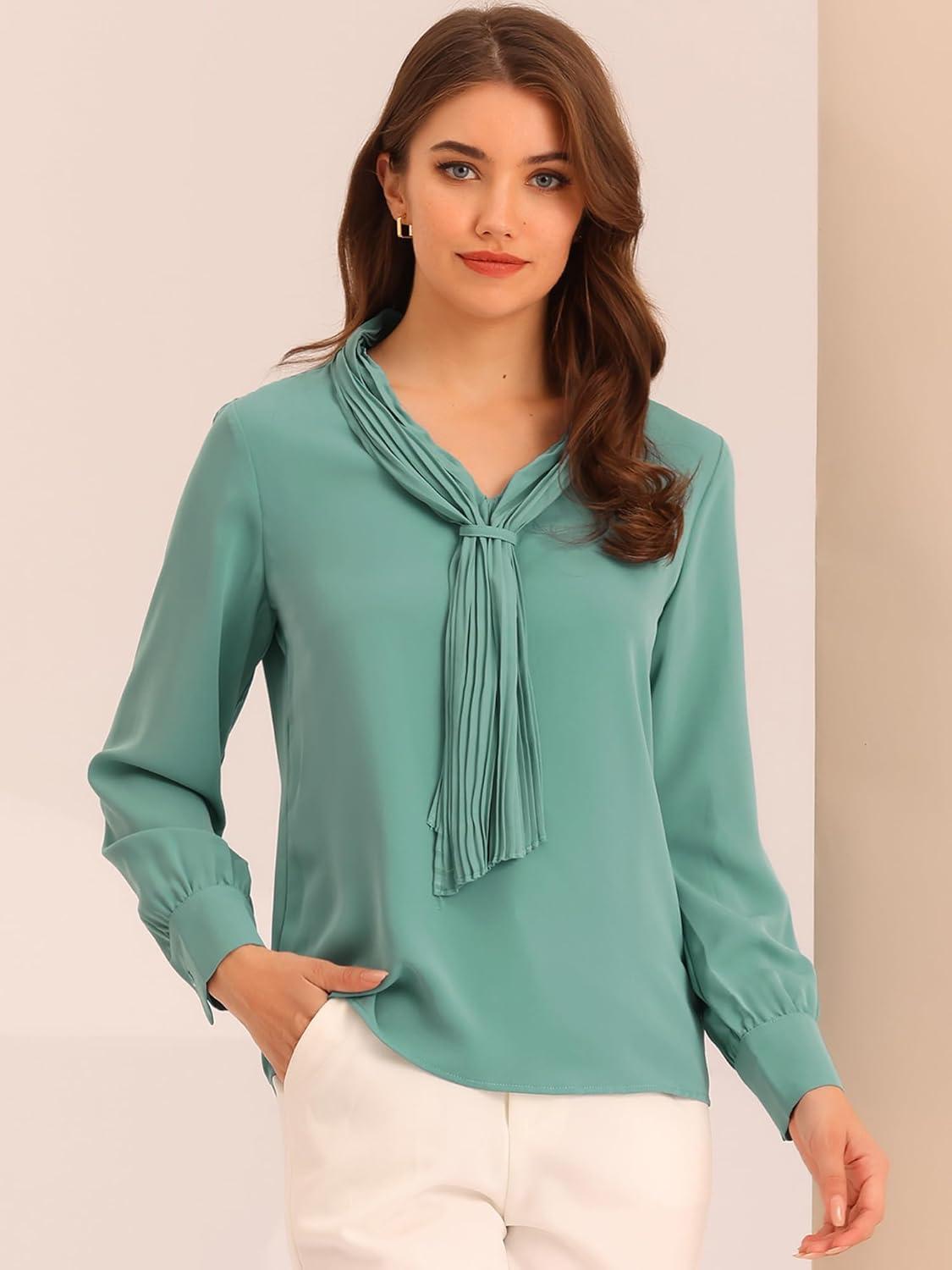 Allegra K Women’s Dressy Long Sleeve Blouses Chiffon Pleated Tie Neck Office Top Shirt(Mint Blue)