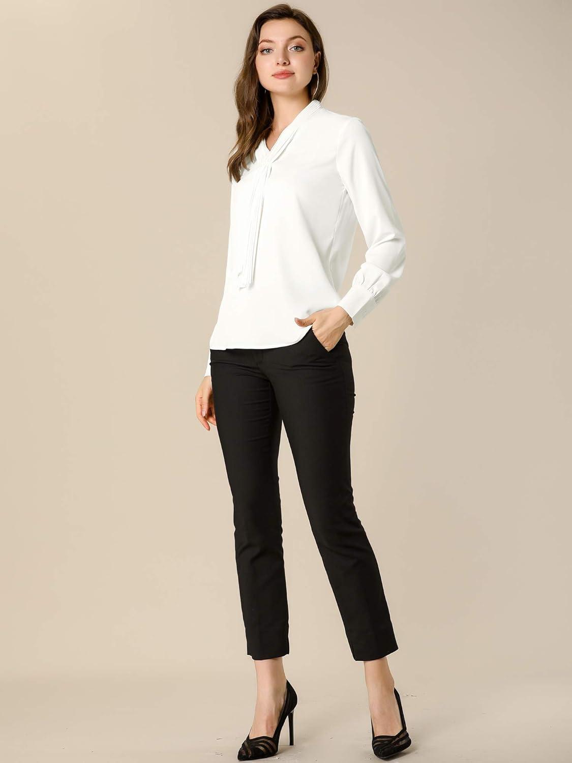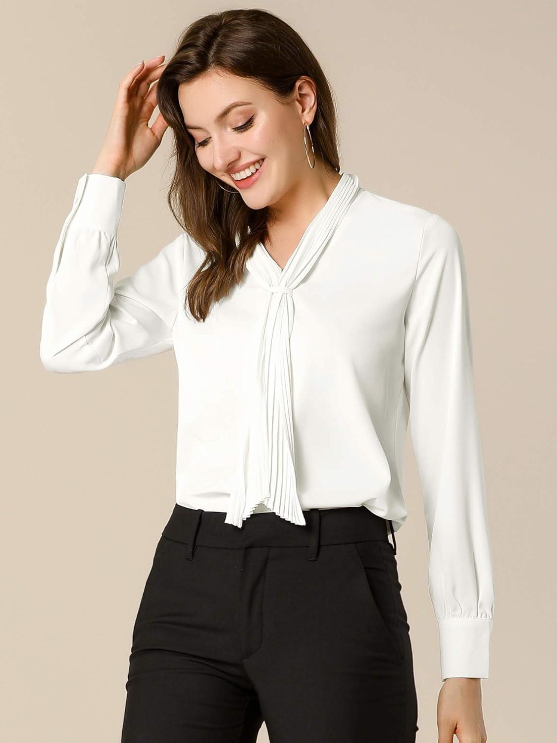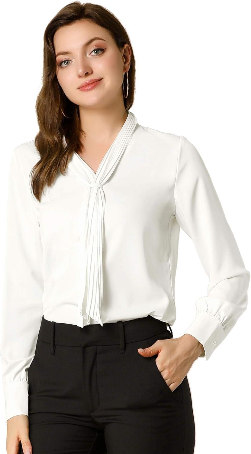 Allegra K Women’s Dressy Long Sleeve Blouses Chiffon Pleated Tie Neck Office Top Shirt(White)