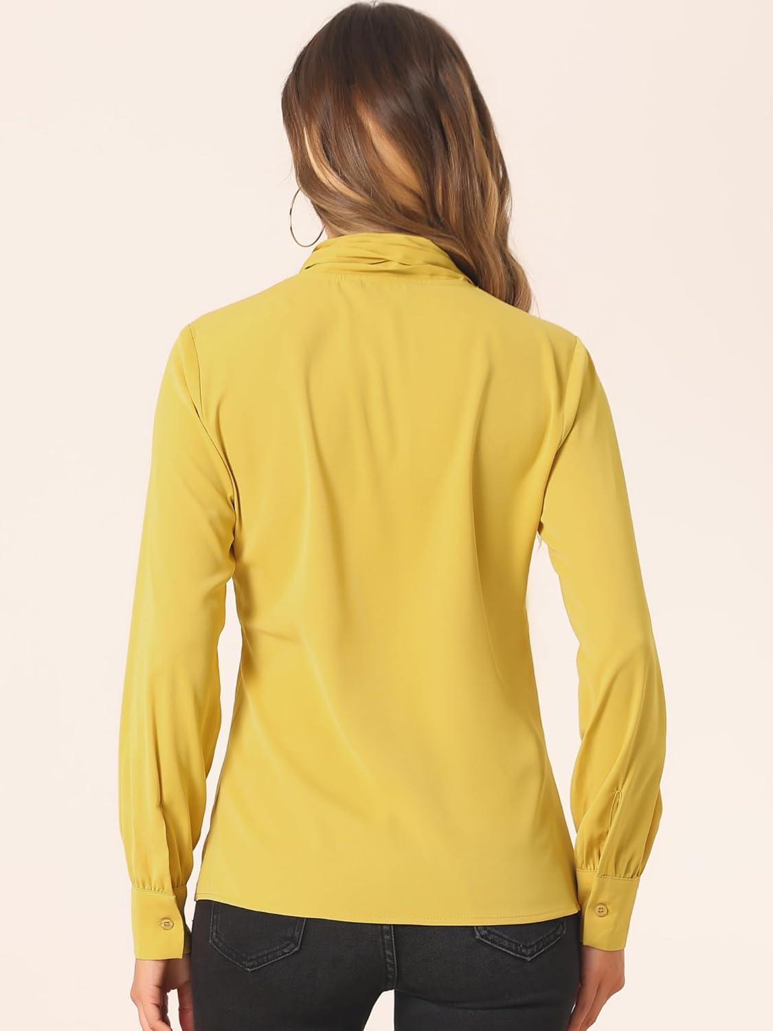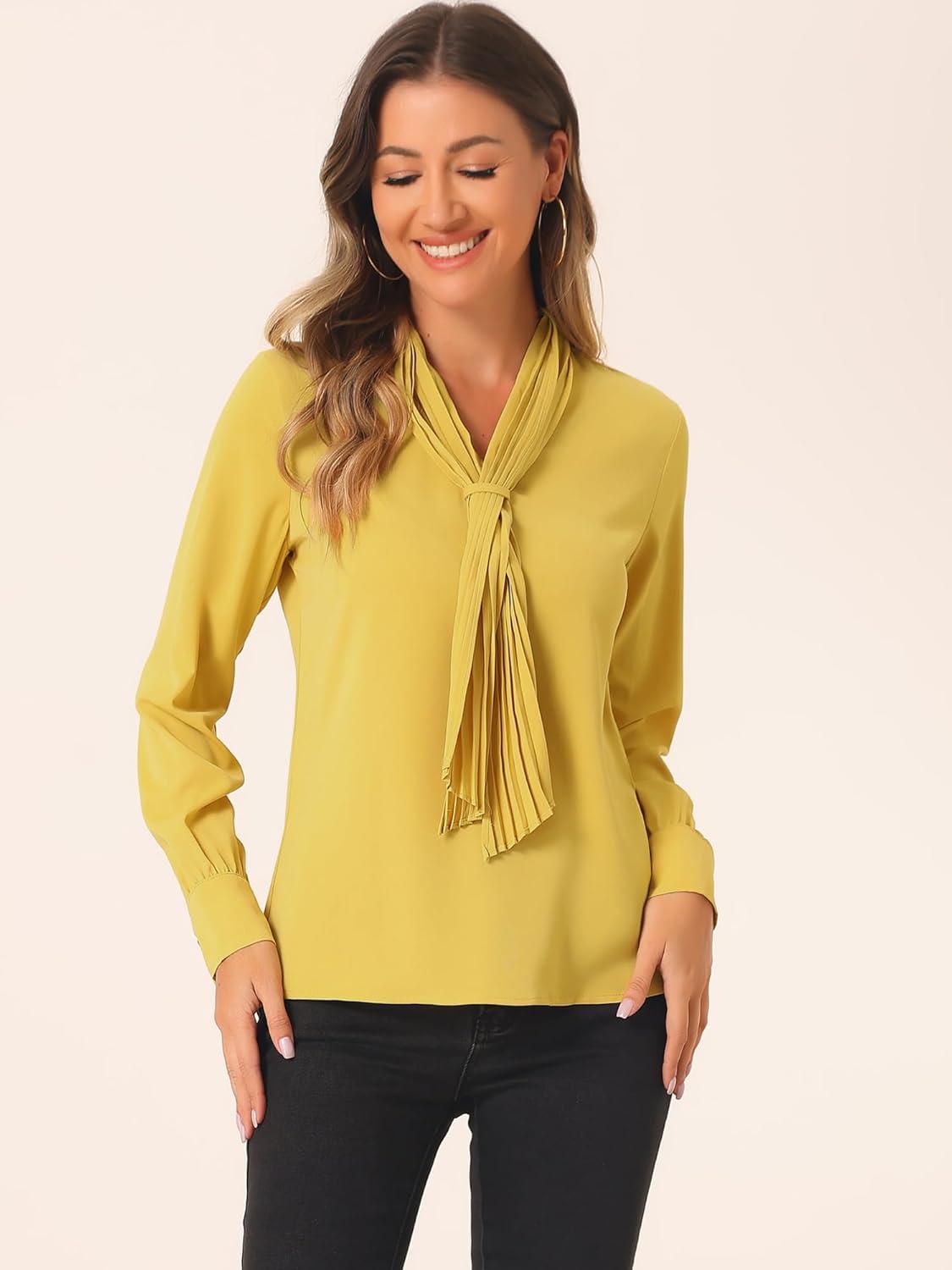 Allegra K Women’s Dressy Long Sleeve Blouses Chiffon Pleated Tie Neck Office Top Shirt(Yellows)