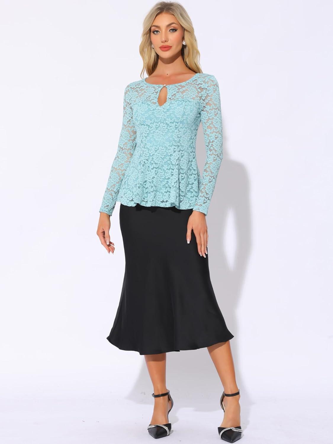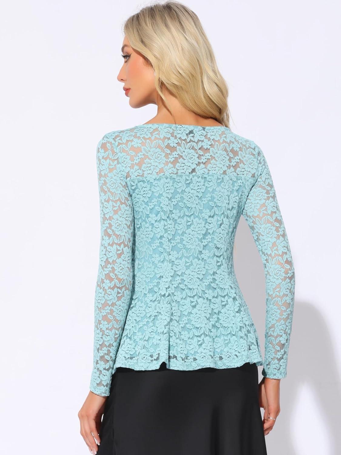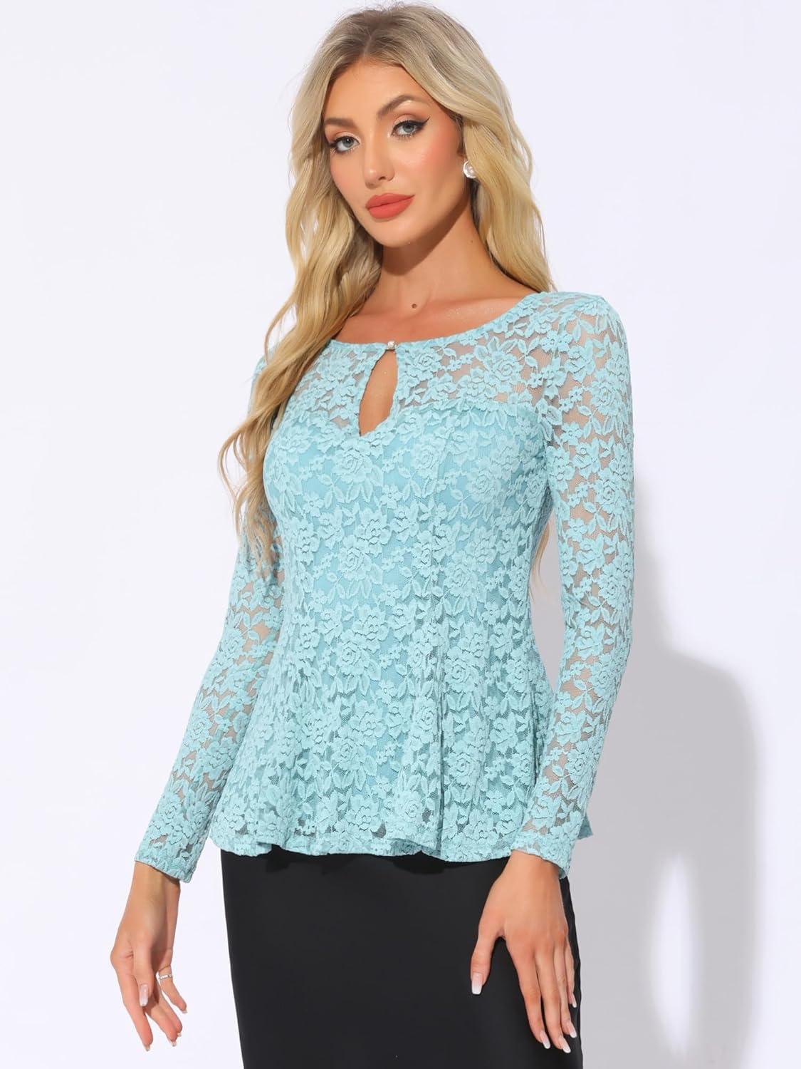 Allegra K Women’s Dressy Top Formal Wedding Guest Long Sleeve Lace Peplum Blouse(Blue)
