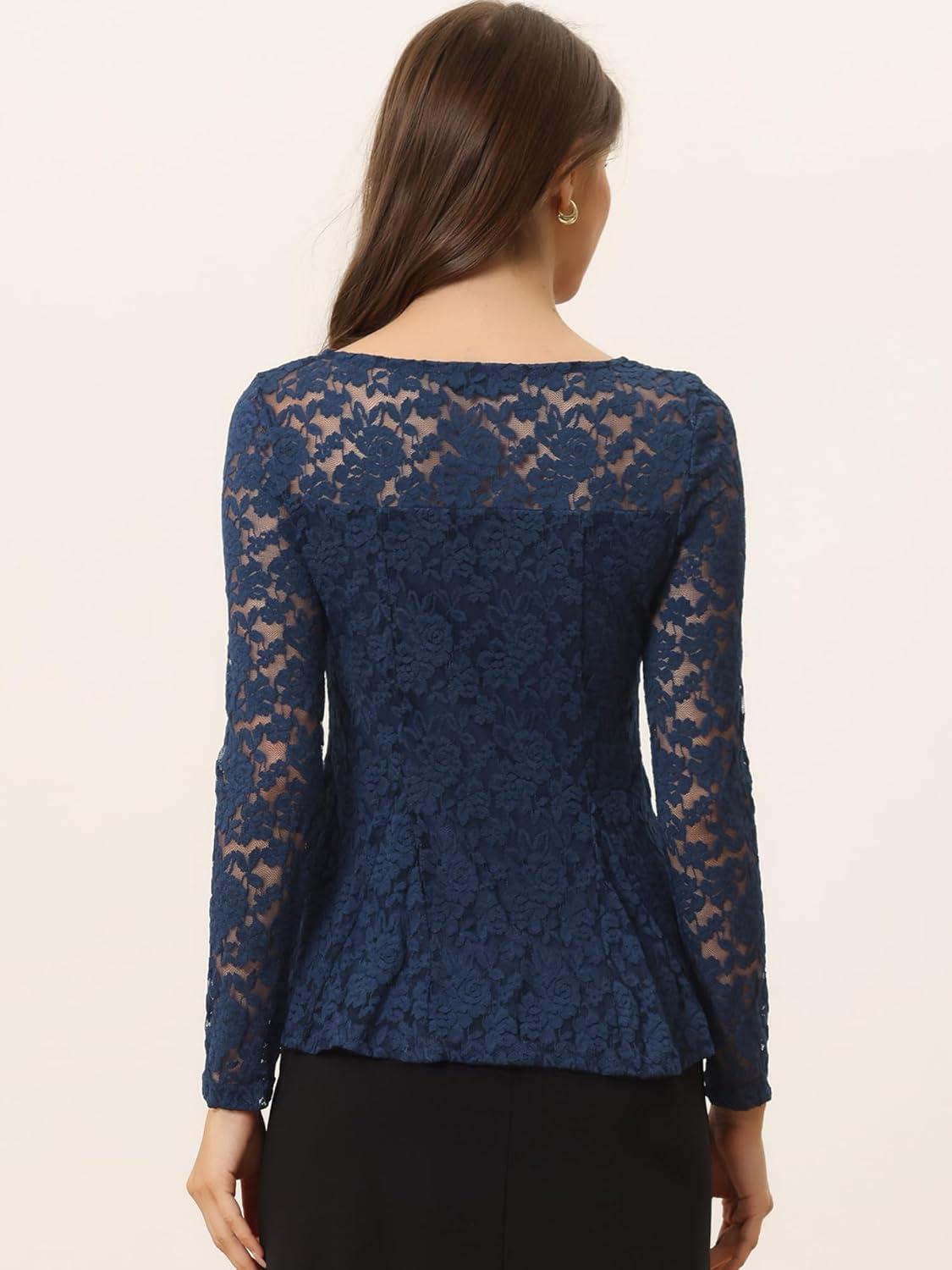 Allegra K Women’s Dressy Top Formal Wedding Guest Long Sleeve Lace Peplum Blouse(Dark Blue)
