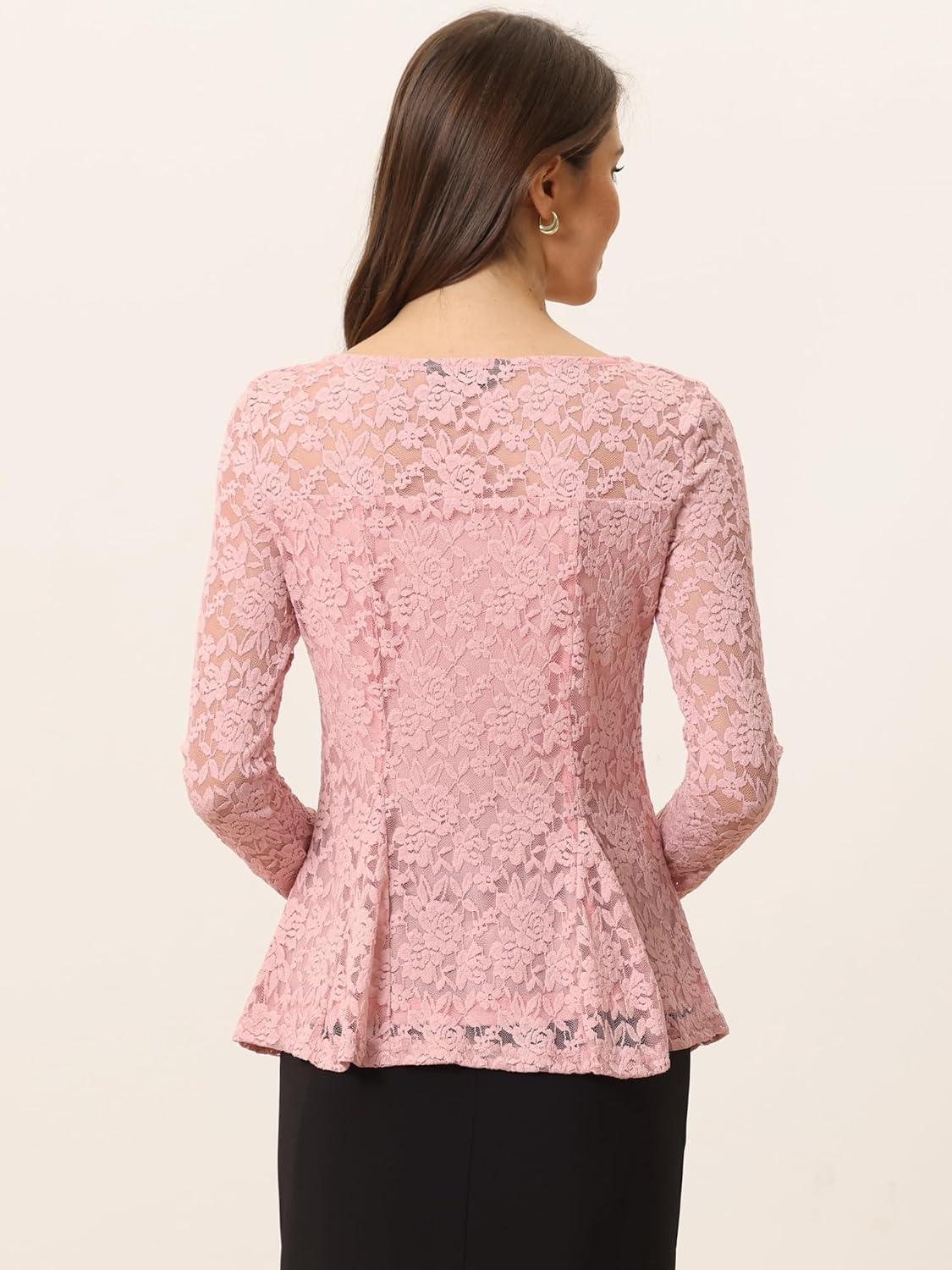 Allegra K Women’s Dressy Top Formal Wedding Guest Long Sleeve Lace Peplum Blouse(Pink)
