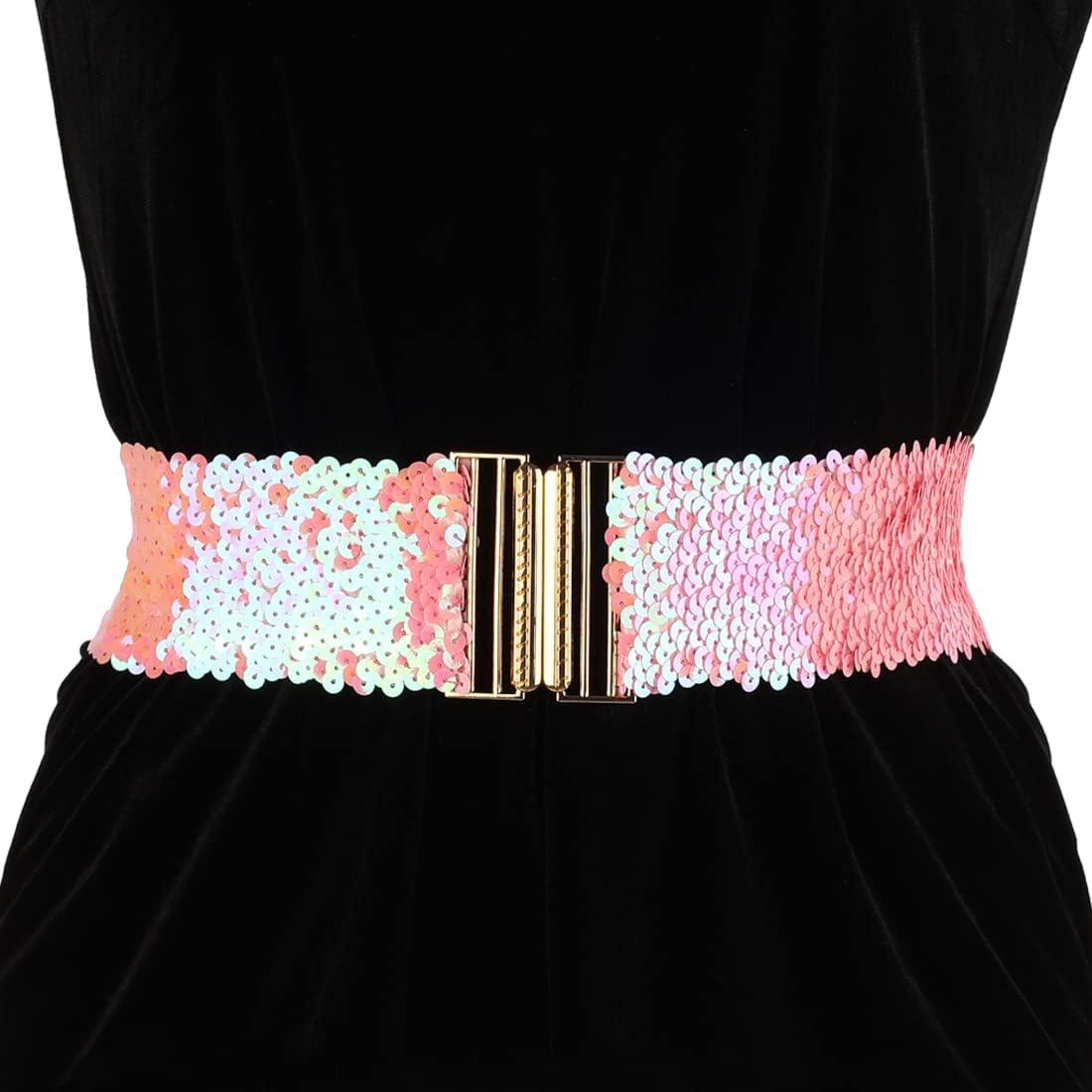 imageAllegra K Womens Elastic Waist Belts Interlock Buckles Sequins Decor Stretchy Wide Belts 2PCSPink