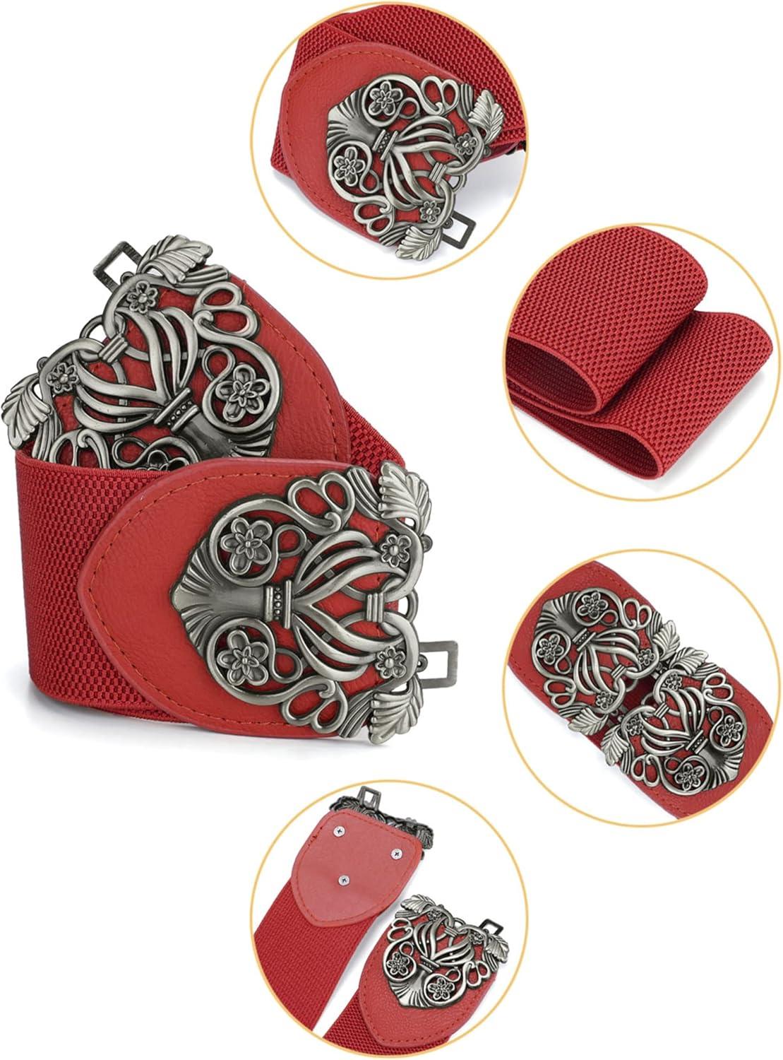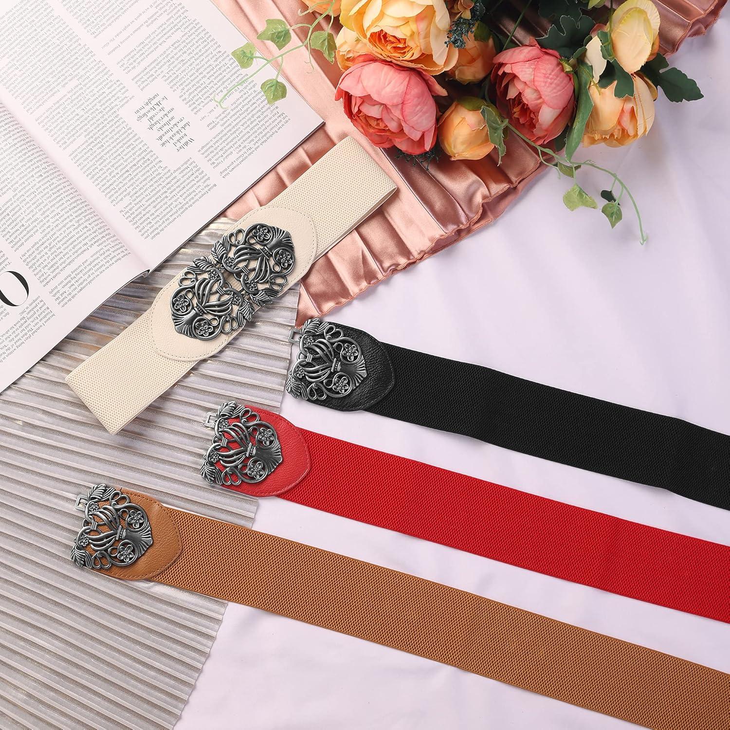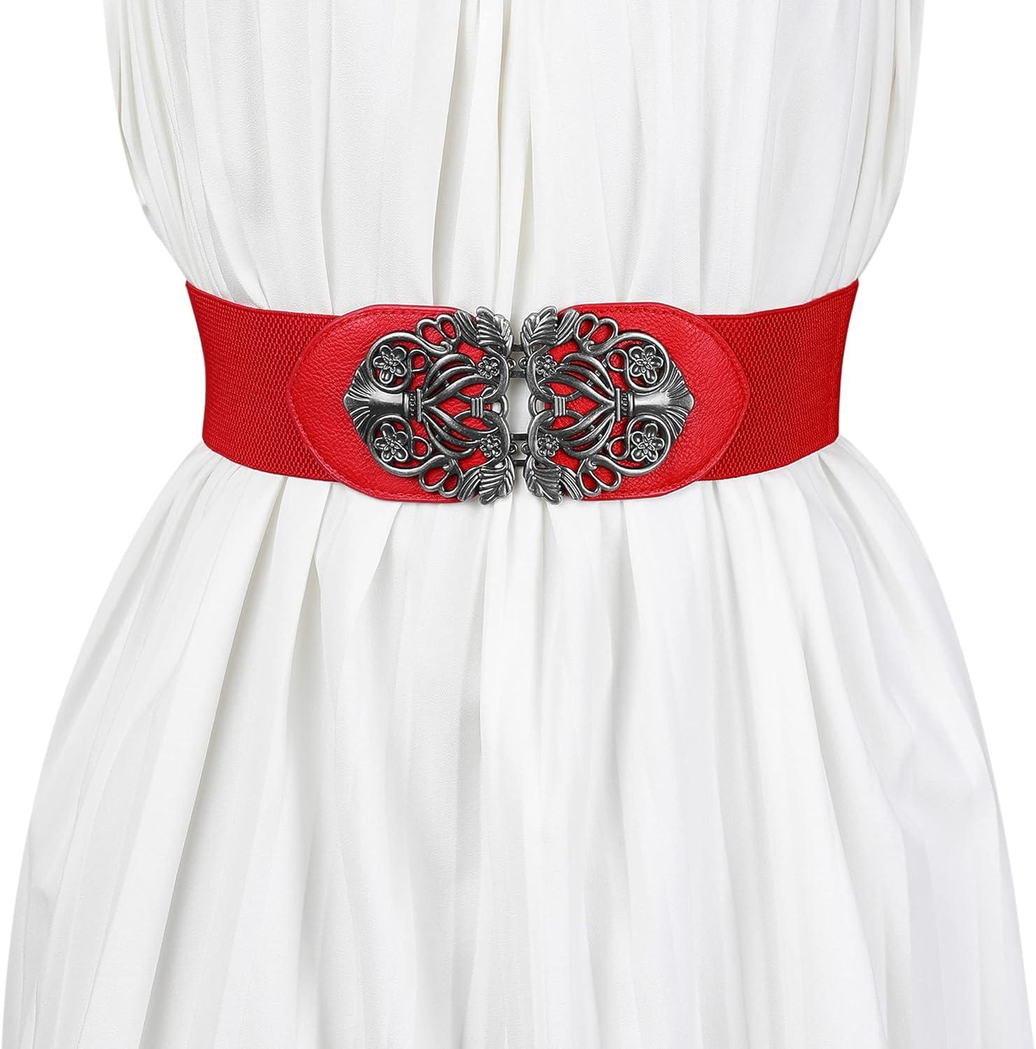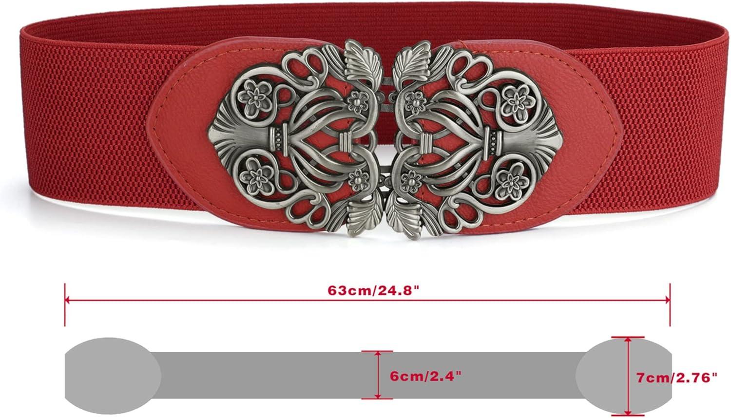 Allegra K Womens Elastic Wide Waist Belts Floral Metal Buckle Stretchy Belts for Dresses(Brown & Red)