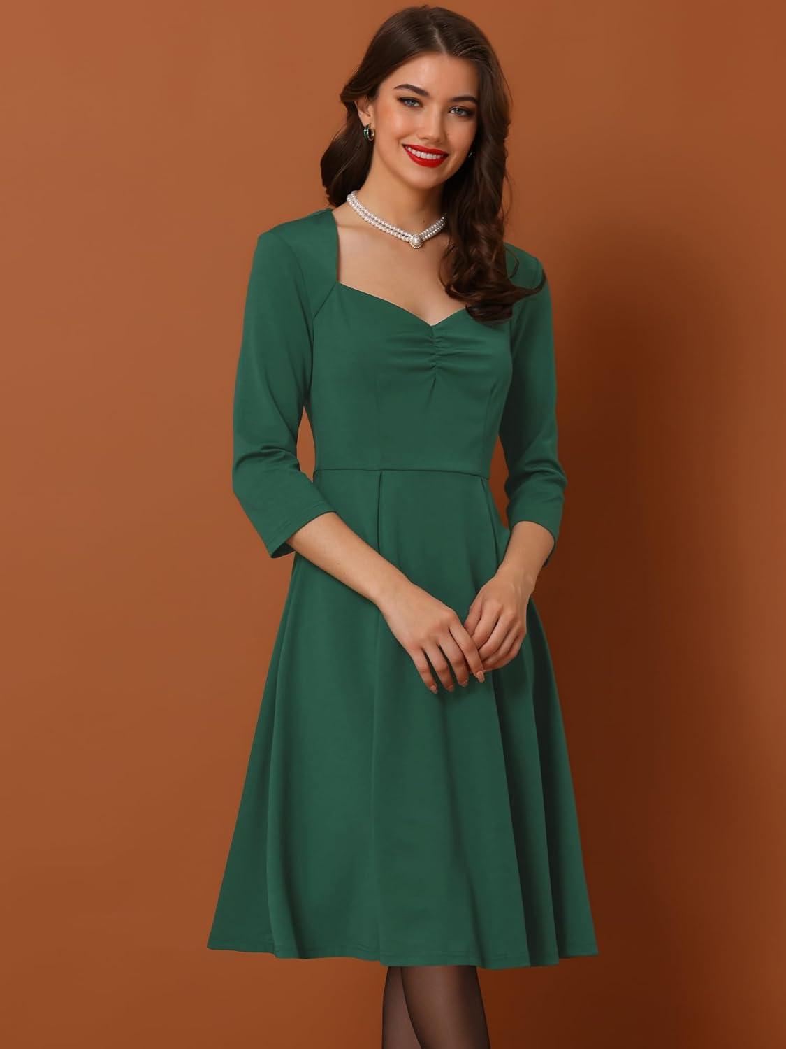Allegra K Women’s Elegant 3/4 Sleeve High Waist Sweetheart Neck A-Line Pleated Midi Dress(Dark Green)