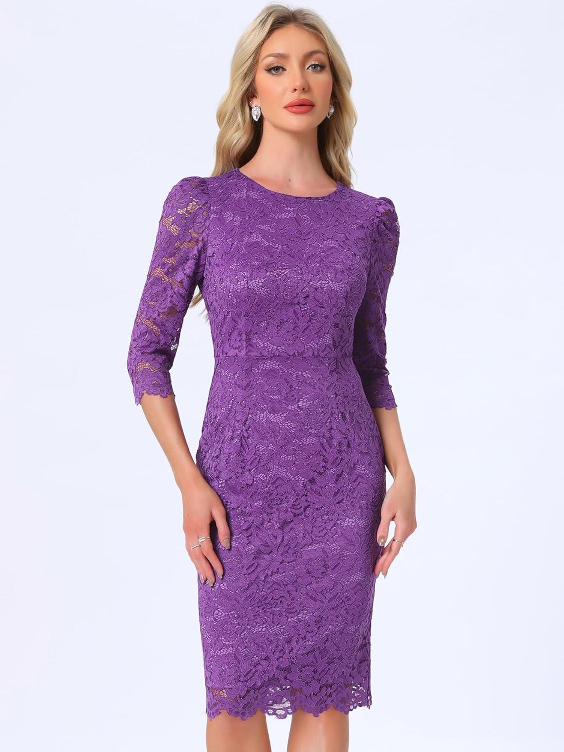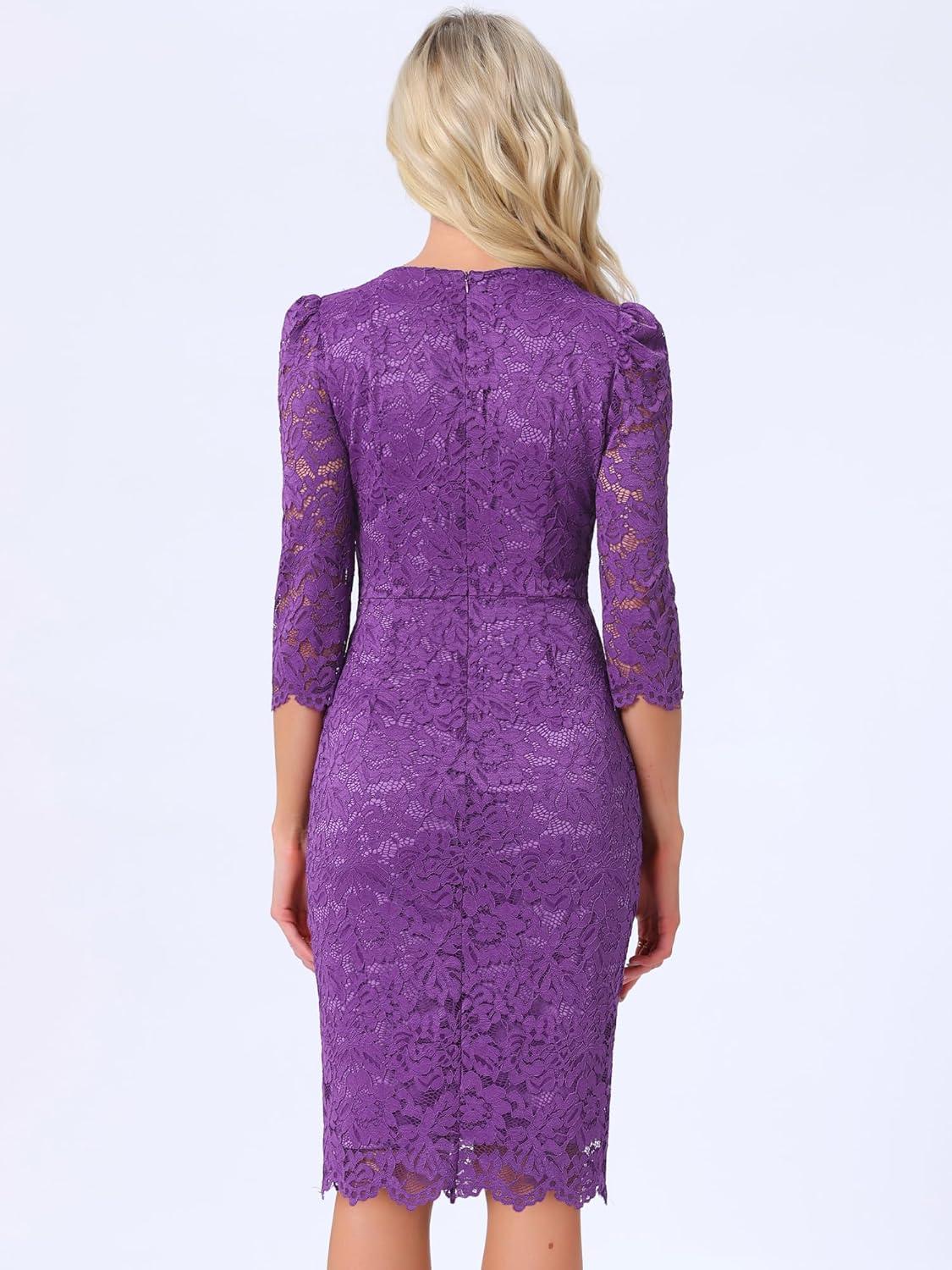 Allegra K Women’s Elegant Lace Dress 3/4 Sleeve Business Wedding Guest Cocktail Bodycon Dress(Purple)