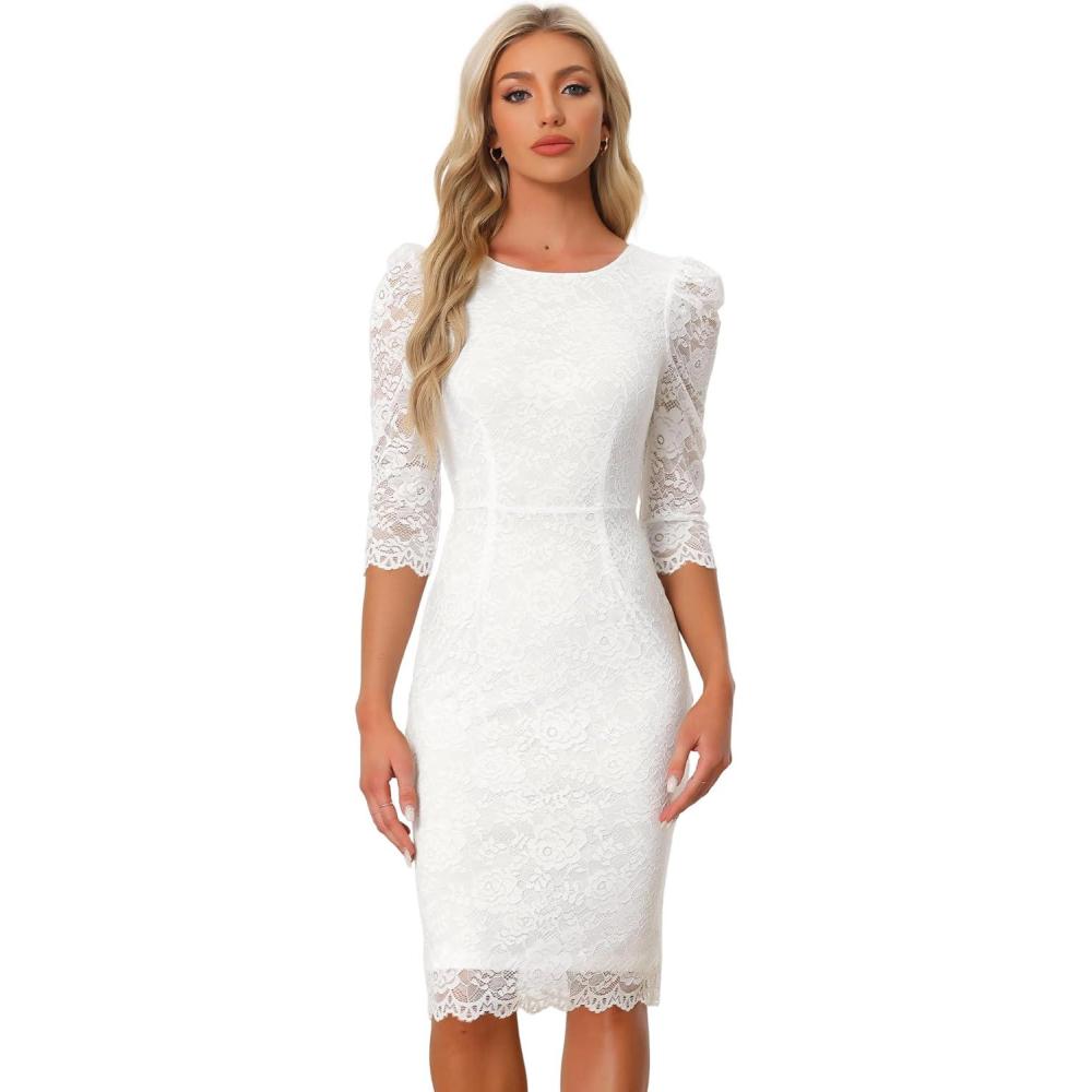 Allegra K Women’s Elegant Lace Dress 3/4 Sleeve Business Wedding Guest Cocktail Bodycon Dress(White)