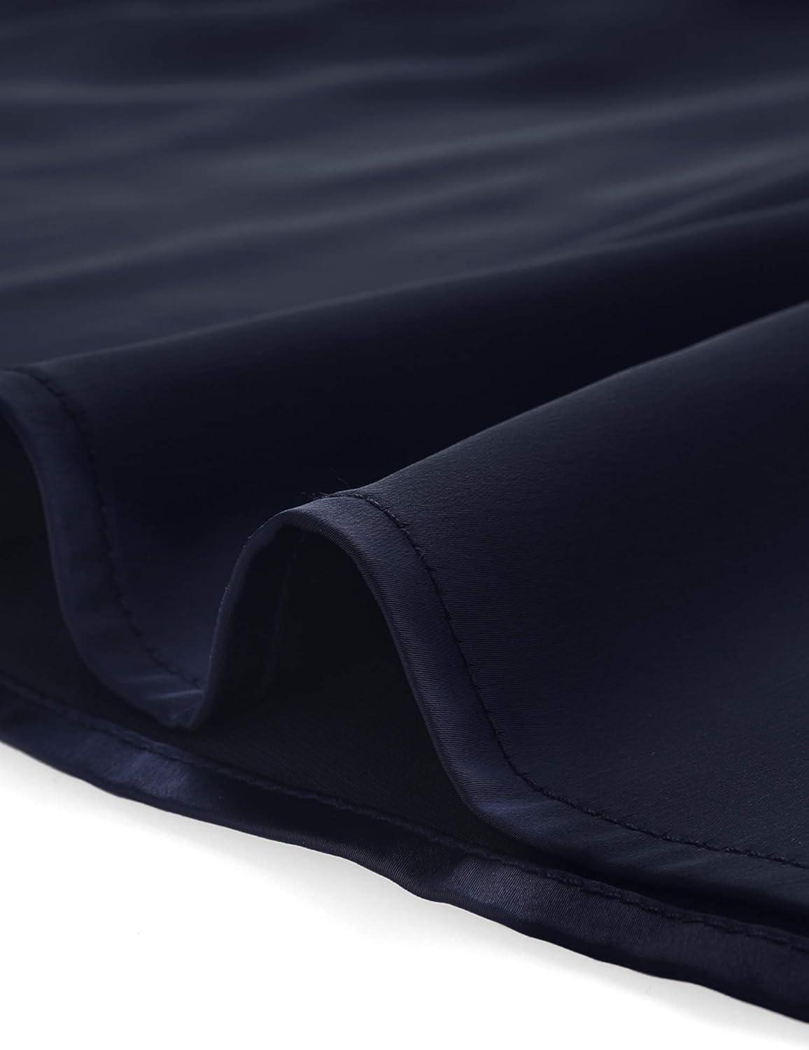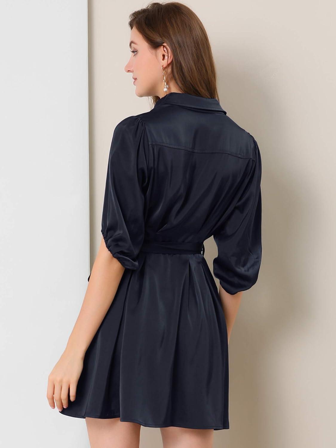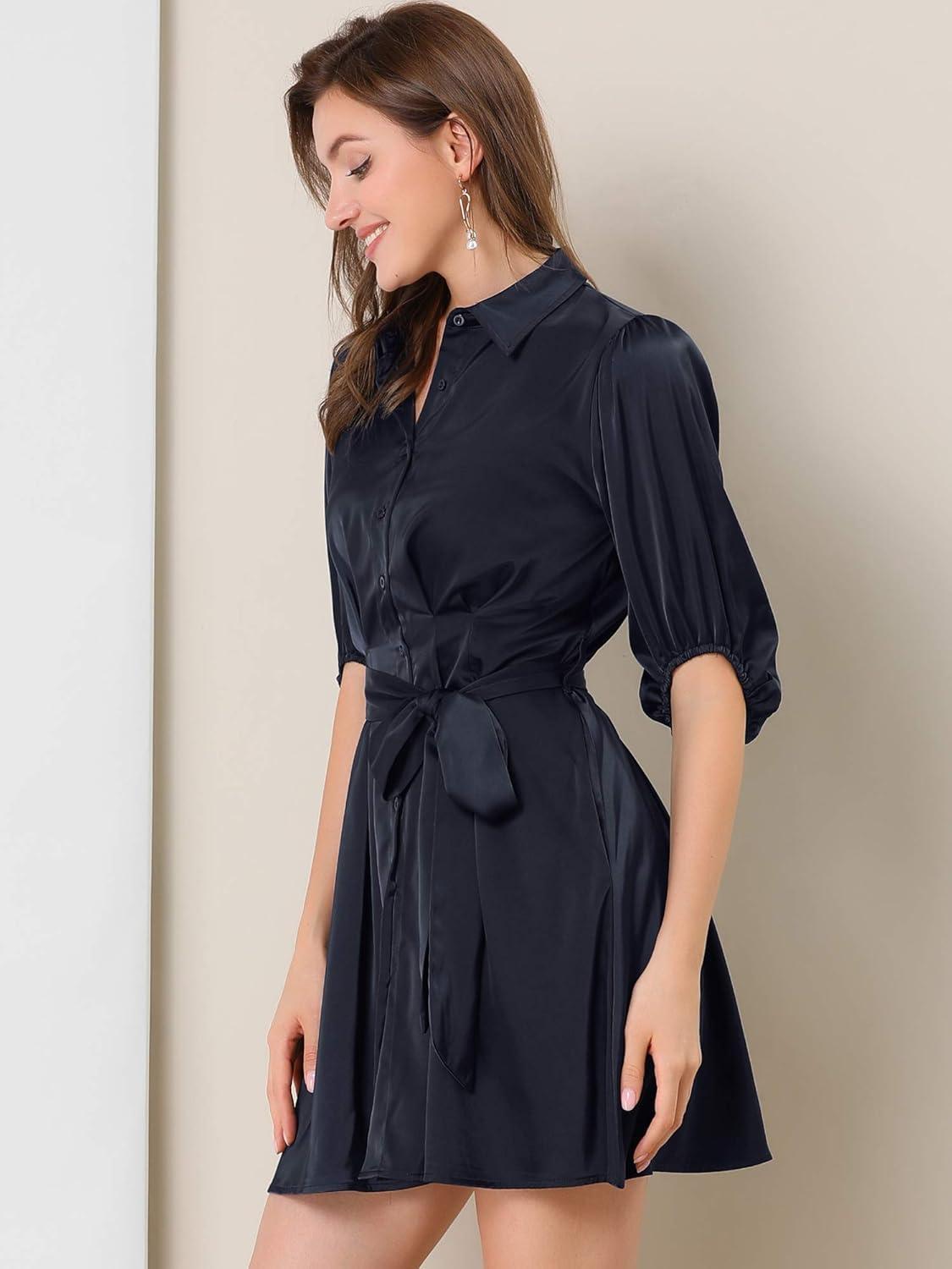 Allegra K Women’s Elegant Satin Dresses Pleated Waist A-Line Belted Puff Sleeve Shirt Dress(Dark Blue)