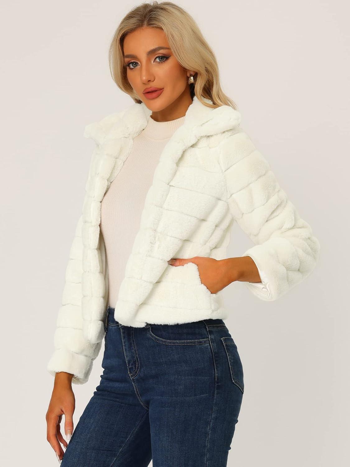 Allegra K Women’s Faux Fur Fluffy Coat Collar 2025 Warm Winter Cropped Jacket(White)