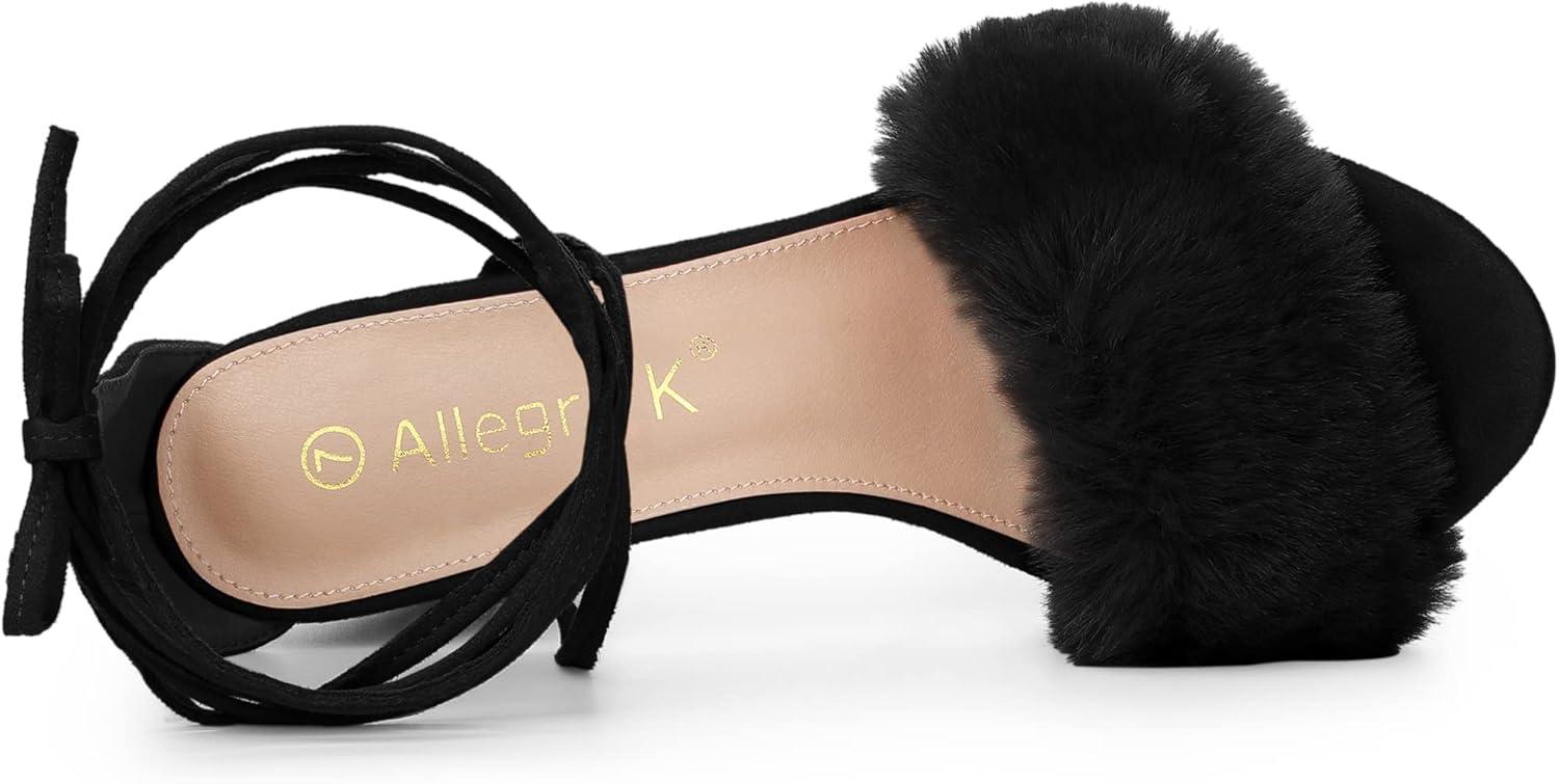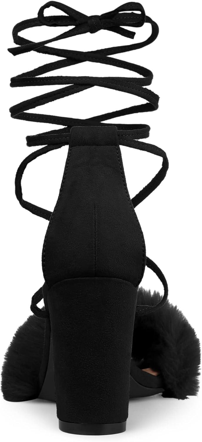 Allegra K Women’s Faux Fur Lace Up Strappy Chunky Heels Sandals(Black)